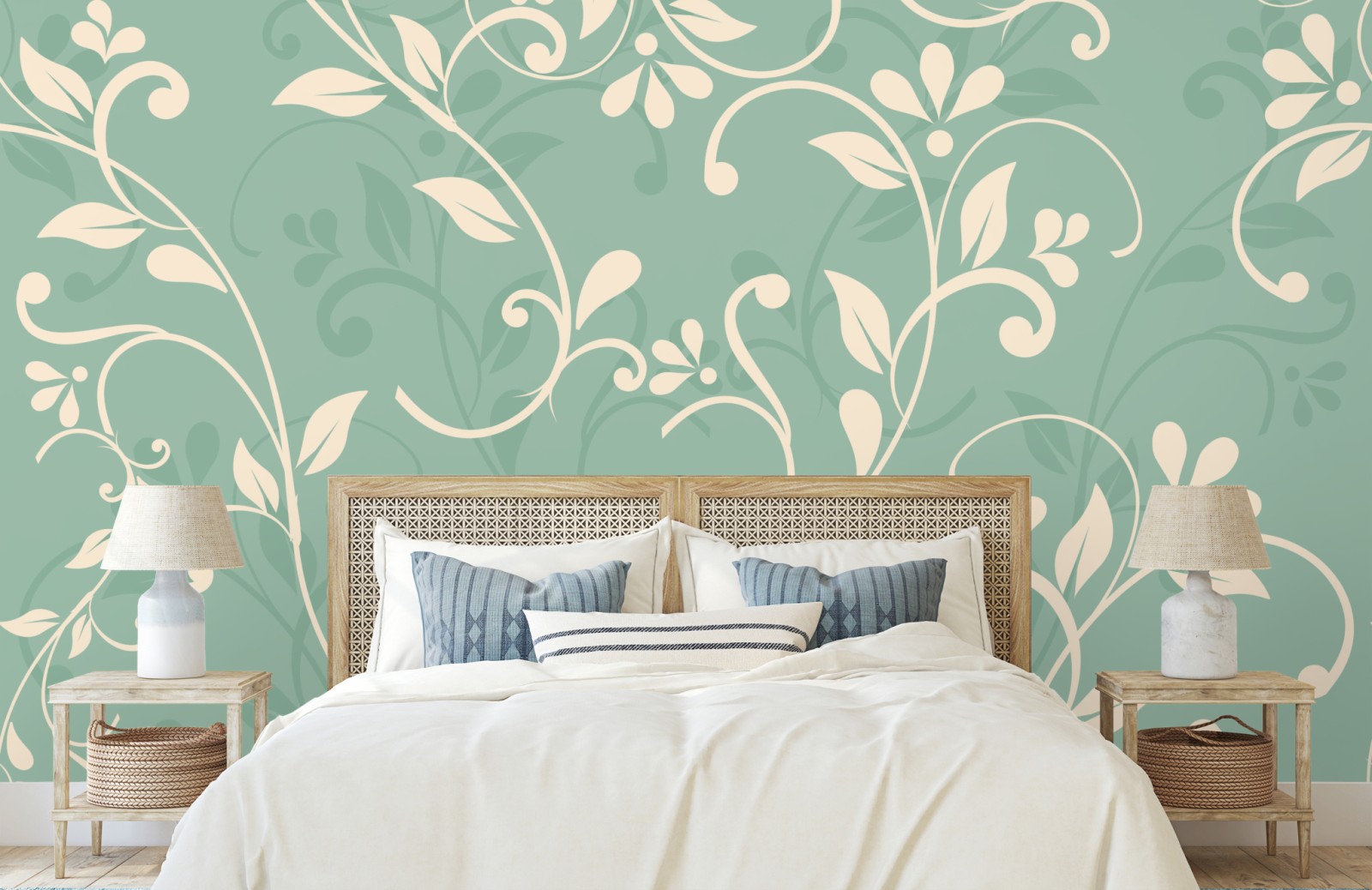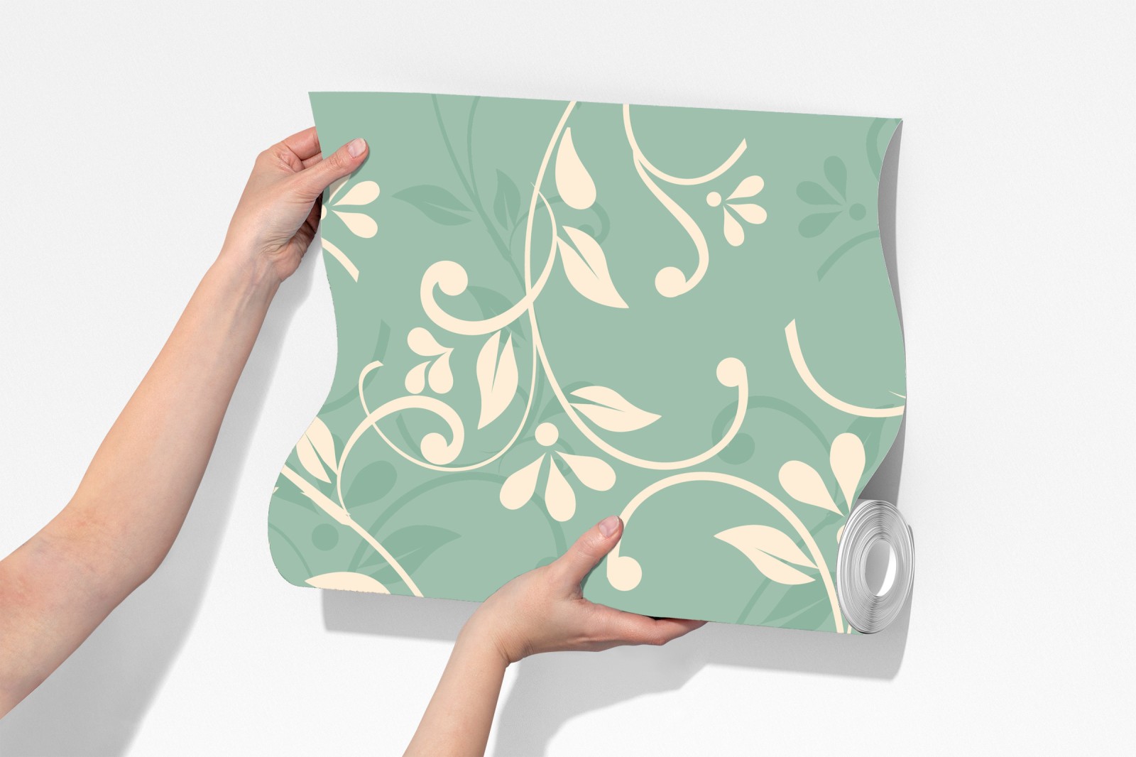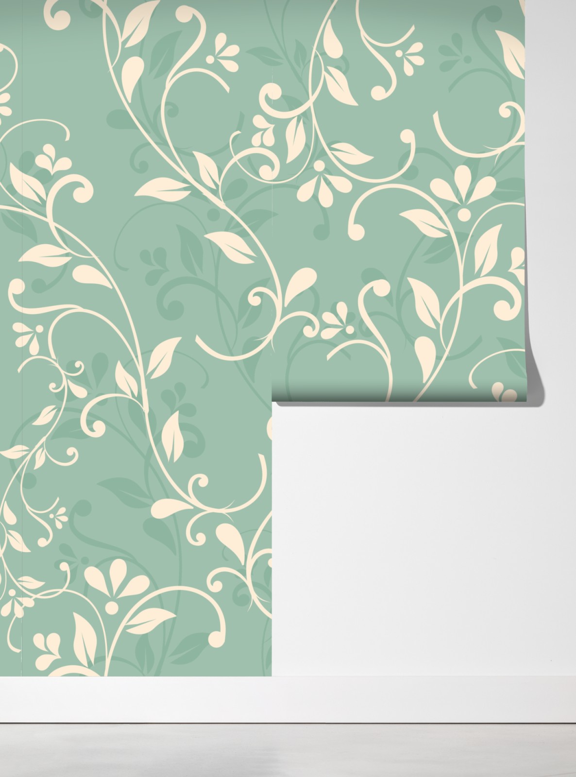 Sanftes mint- und cremefarbenes botanisches Muster mit filigranen Ranken und Blättern verleiht jedem Raum zeitlosen Vintage-Charme.