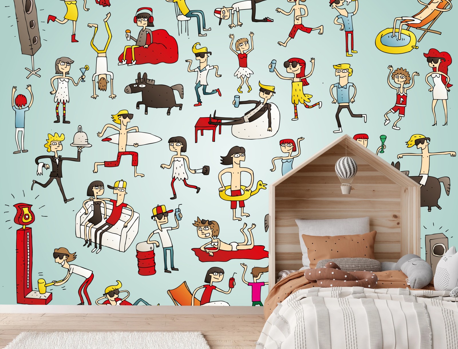 Fototapete Verspielte cartoonszene auf türkisem hintergrund