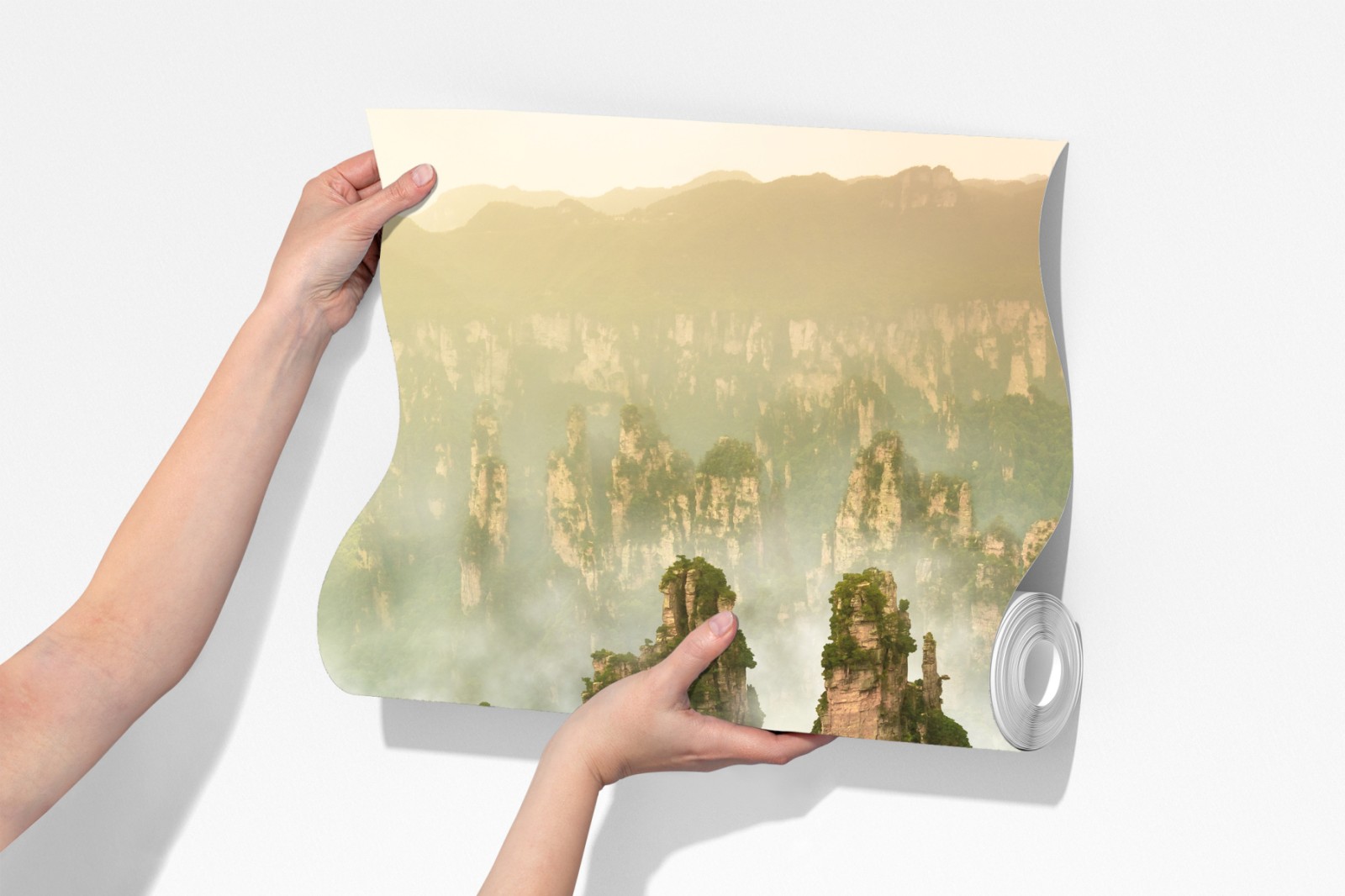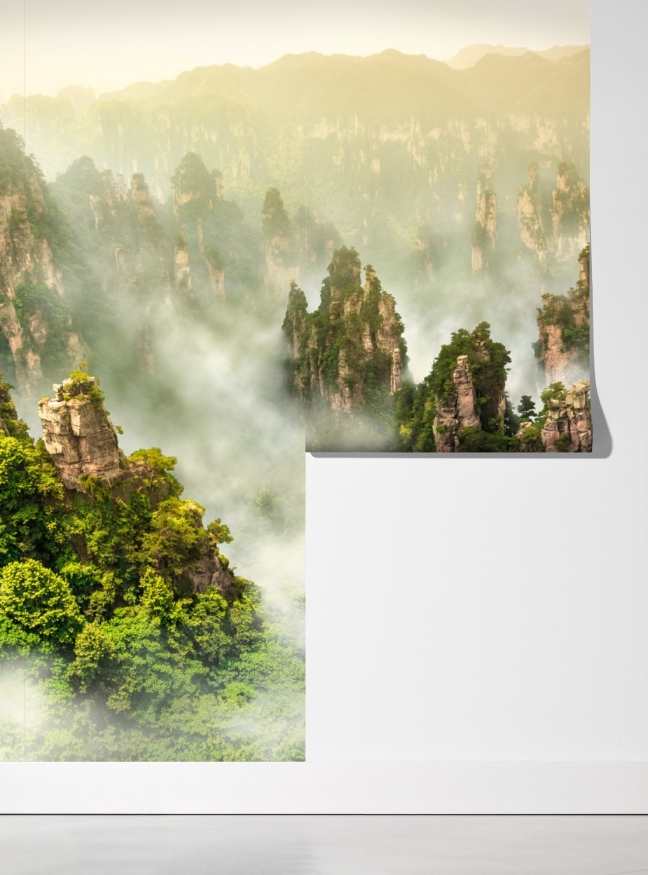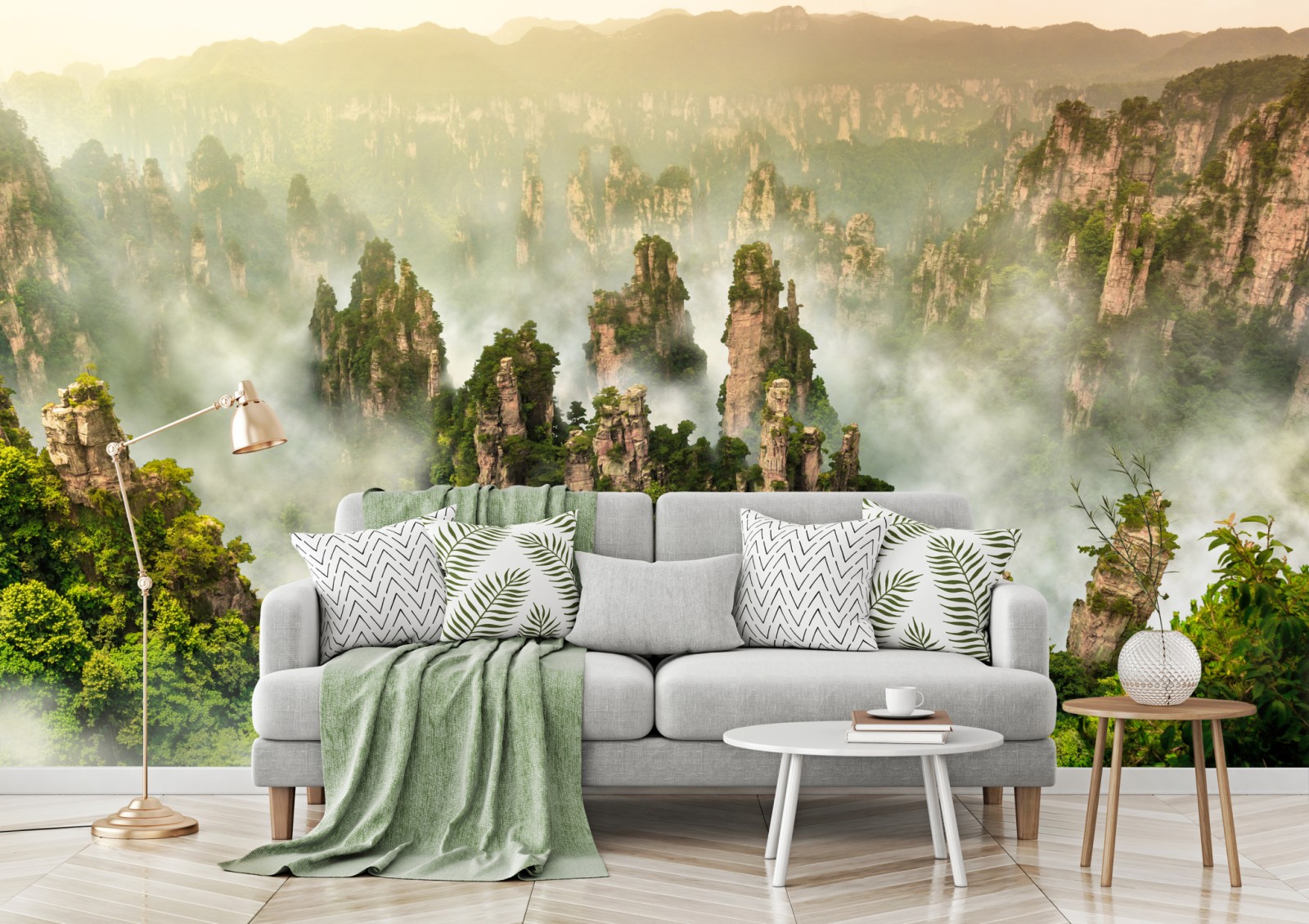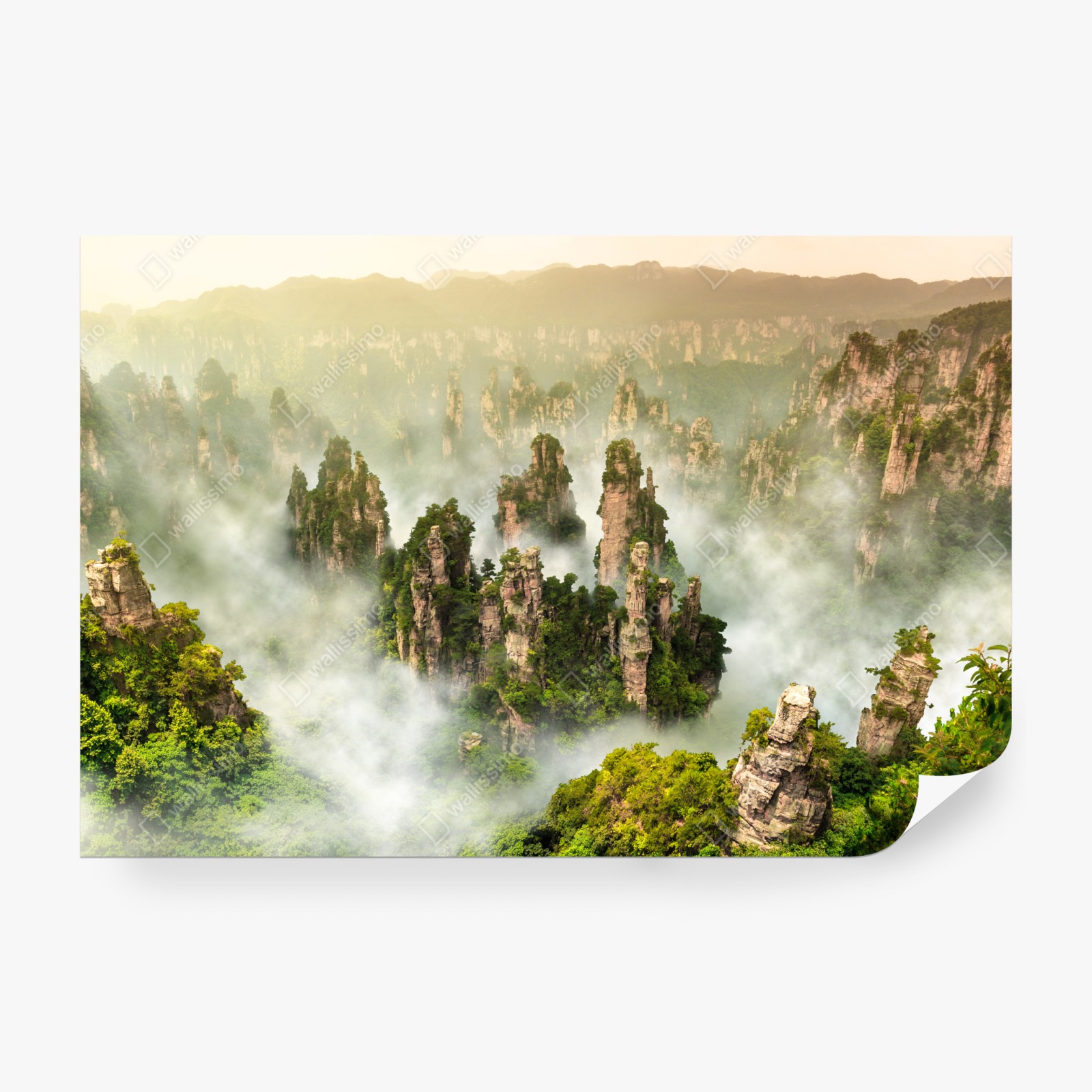 Atemberaubende Ansicht der in Nebel gehüllten Sandsteinsäulen von Zhangjiajie, die natürliche Ruhe und Tiefe an jede Wand bringen.