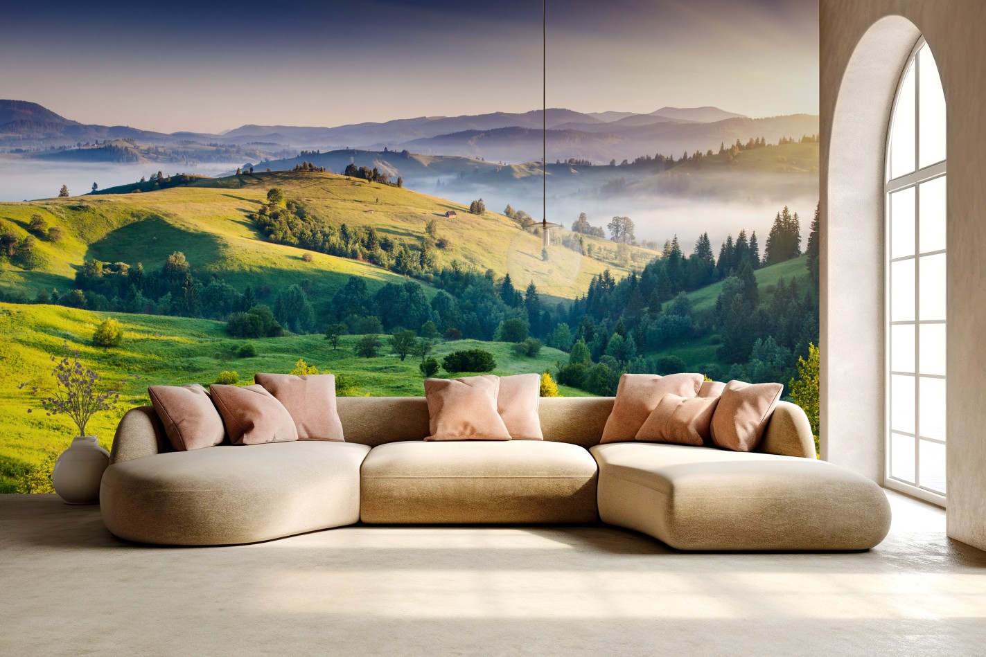 Fototapete Sonnenuntergang in den Karpaten über sanften grünen Hügeln