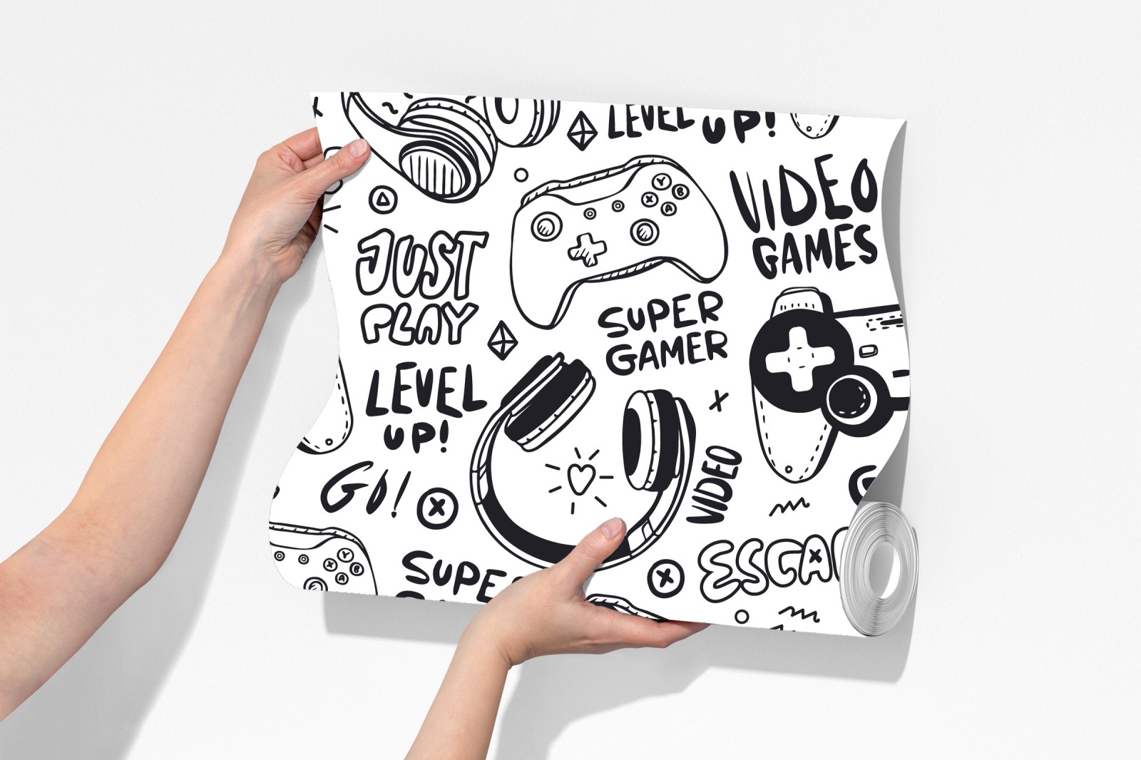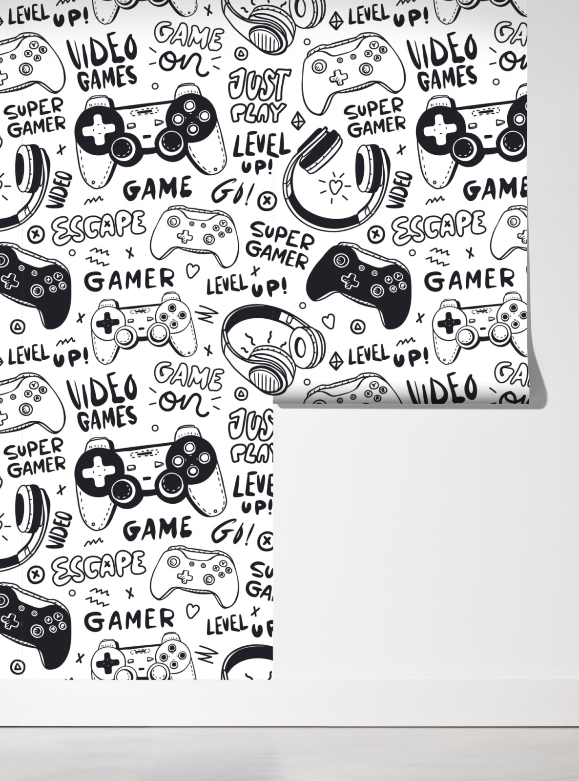 Kraftvolles schwarz-weißes Doodle-Muster mit Controllern und Kopfhörern, ideal für Spielzimmer und moderne Wohnakzente.