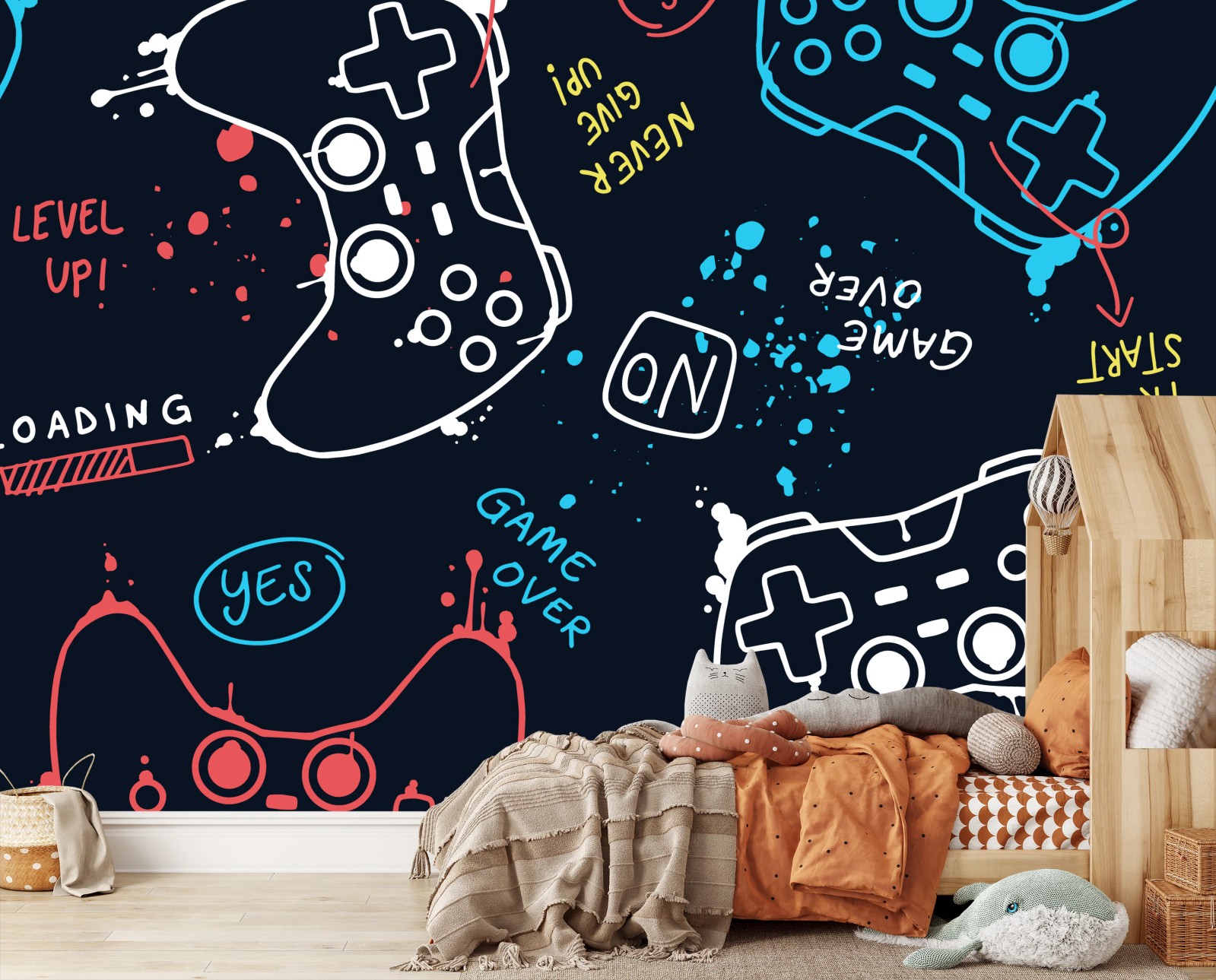 kräftiges und verspieltes gamepad-muster mit neonfarbenen akzenten und dynamischen spritzern belebt kinderzimmer oder gaming-bereich.MehrWeniger