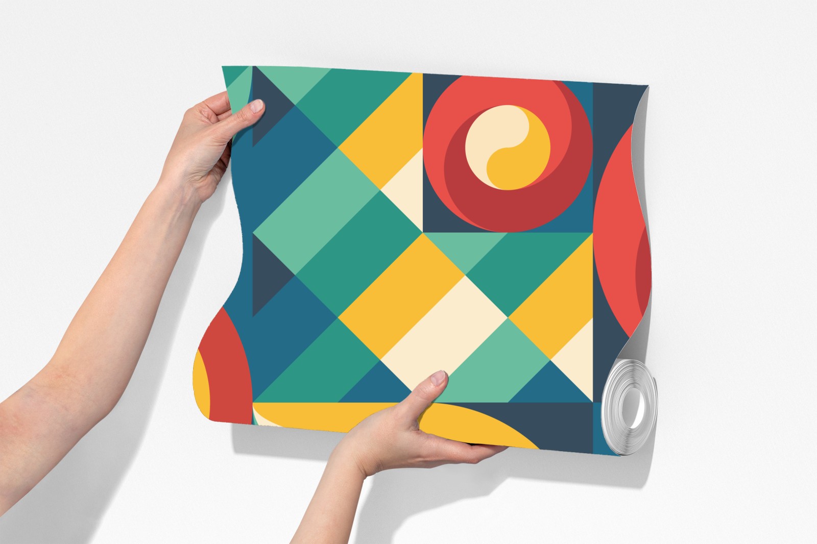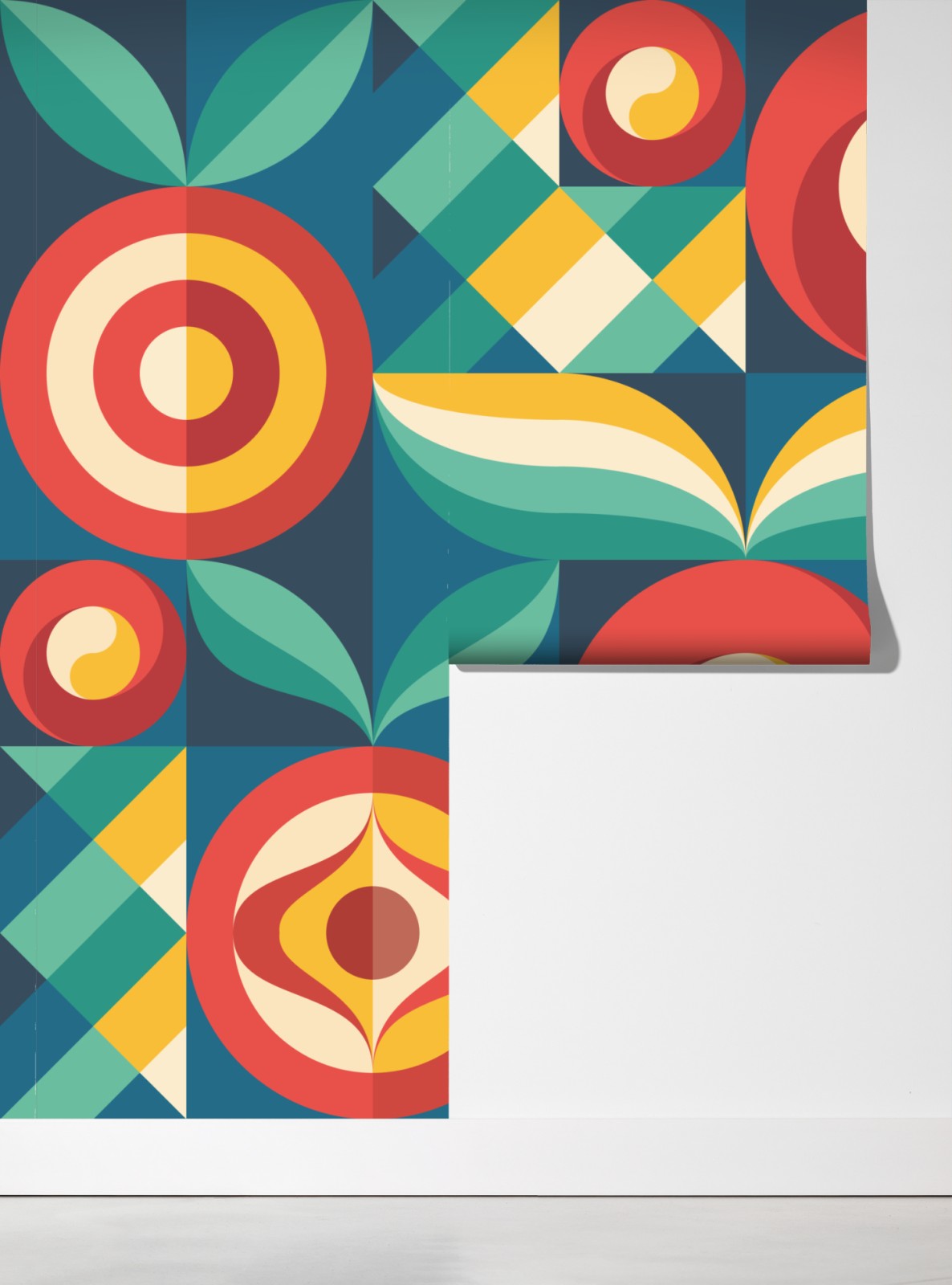 Lebhafte geometrische Blumen in kräftigen Farben verleihen modernen Retro-Charme und Energie jedem Raum.