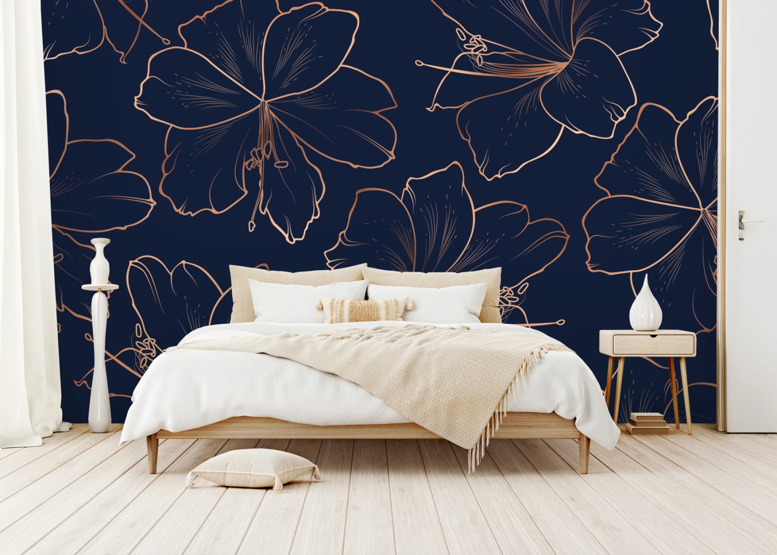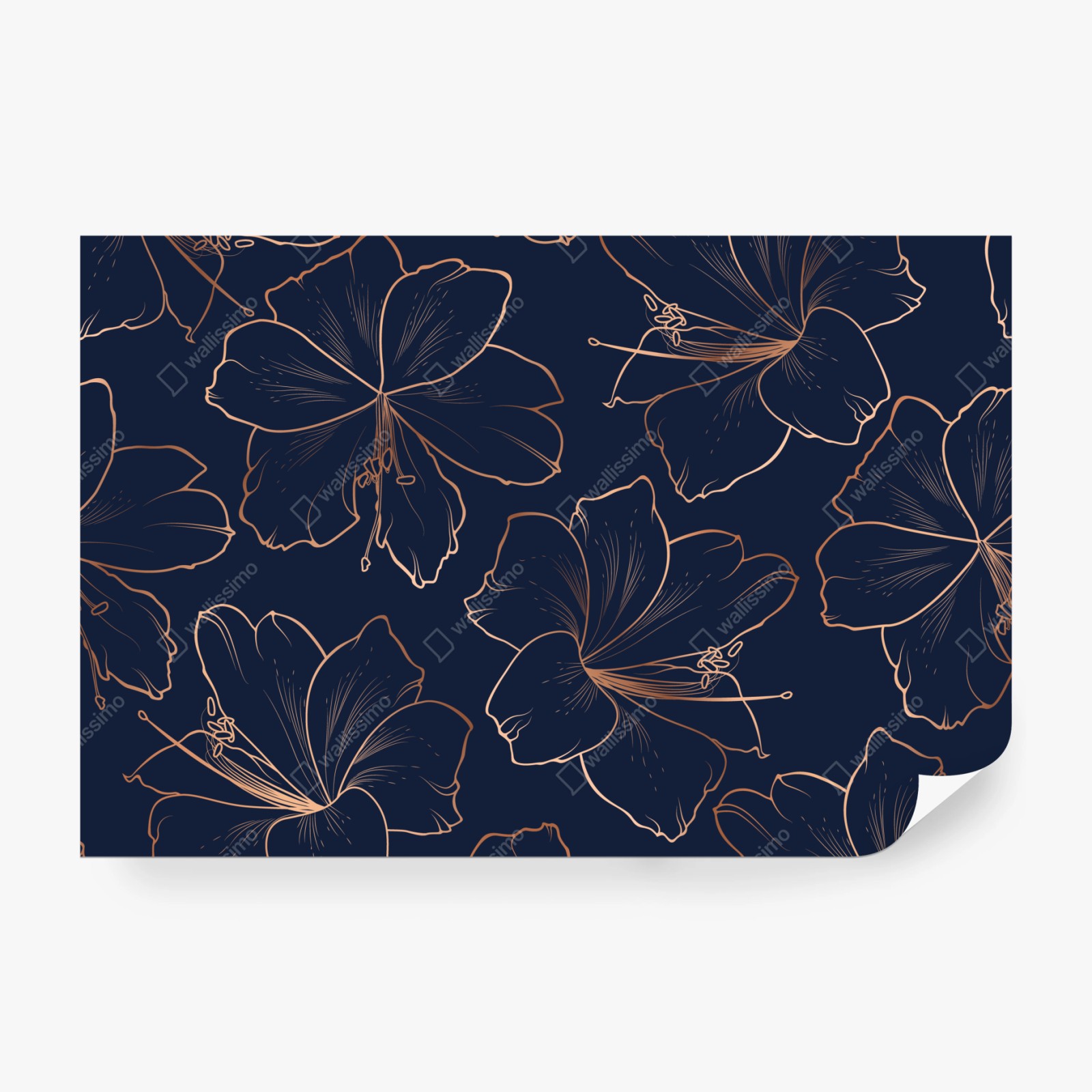 Fototapete Dunkelblaues muster mit goldenen blumenkonturen