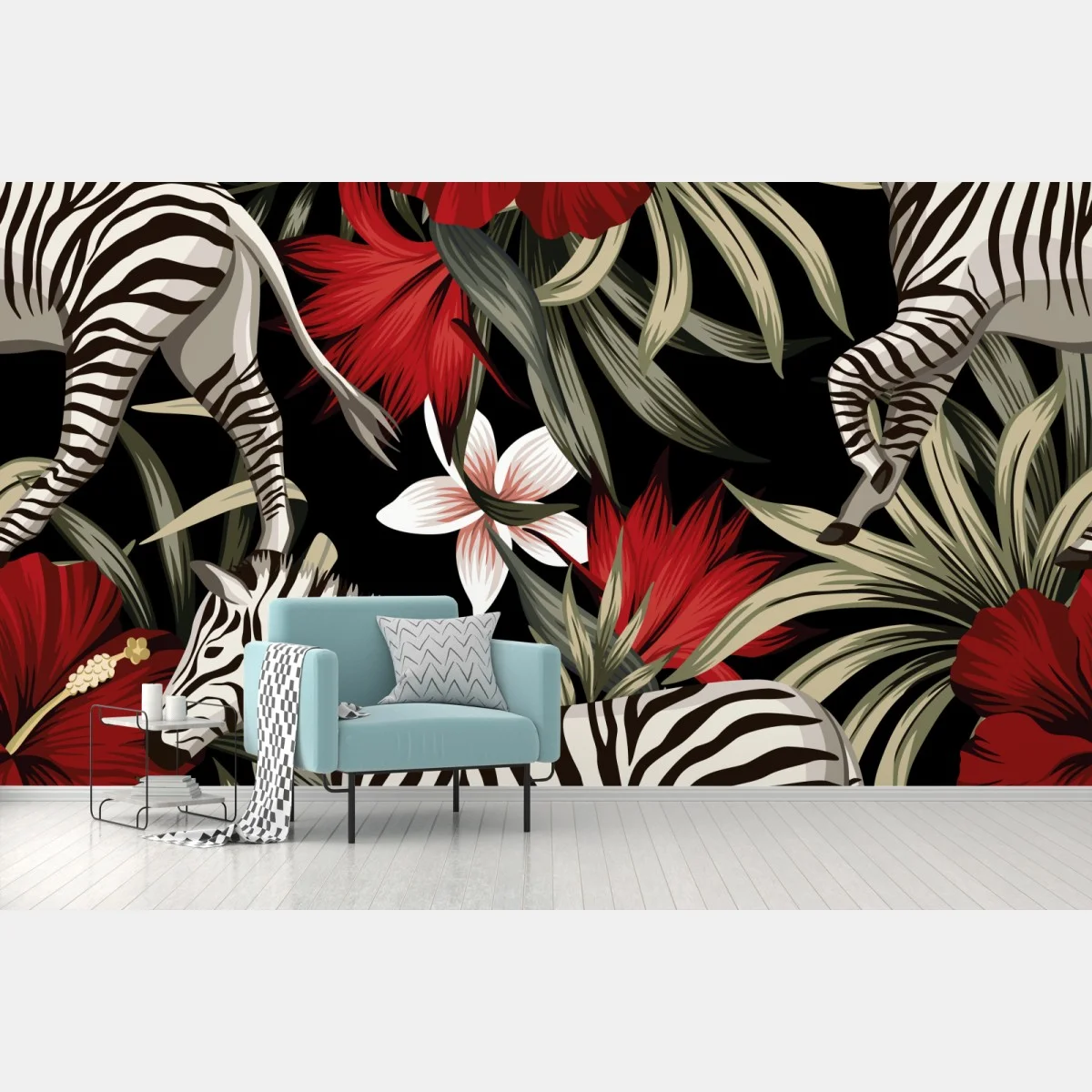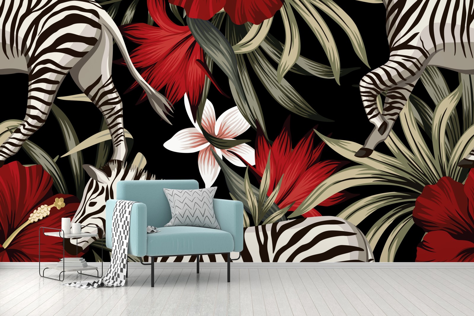 Kräftiges tropisches Muster mit Zebras, Hibiskusblüten und üppigen Blättern auf tiefschwarzem Hintergrund, ideal um jedem Raum exotisches Flair zu verleihen.MehrWeniger