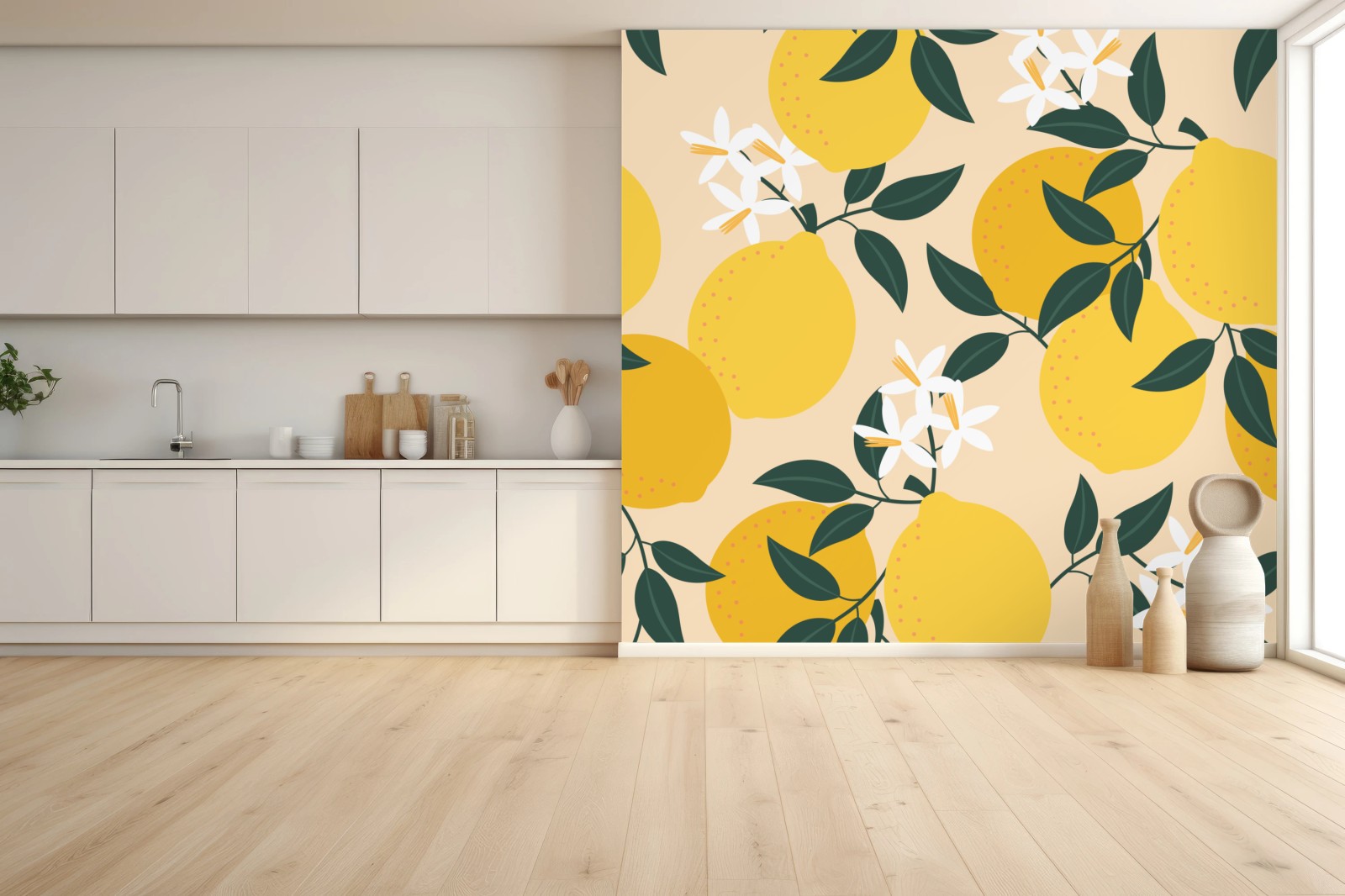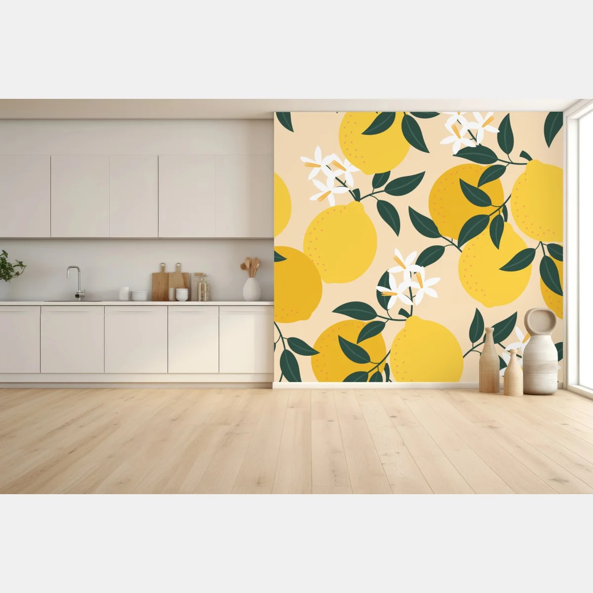 lebhaftes muster mit zitronen und blüten verleiht jedem raum frische und sonnige atmosphäre, ideal für küche und esszimmer.MehrWeniger