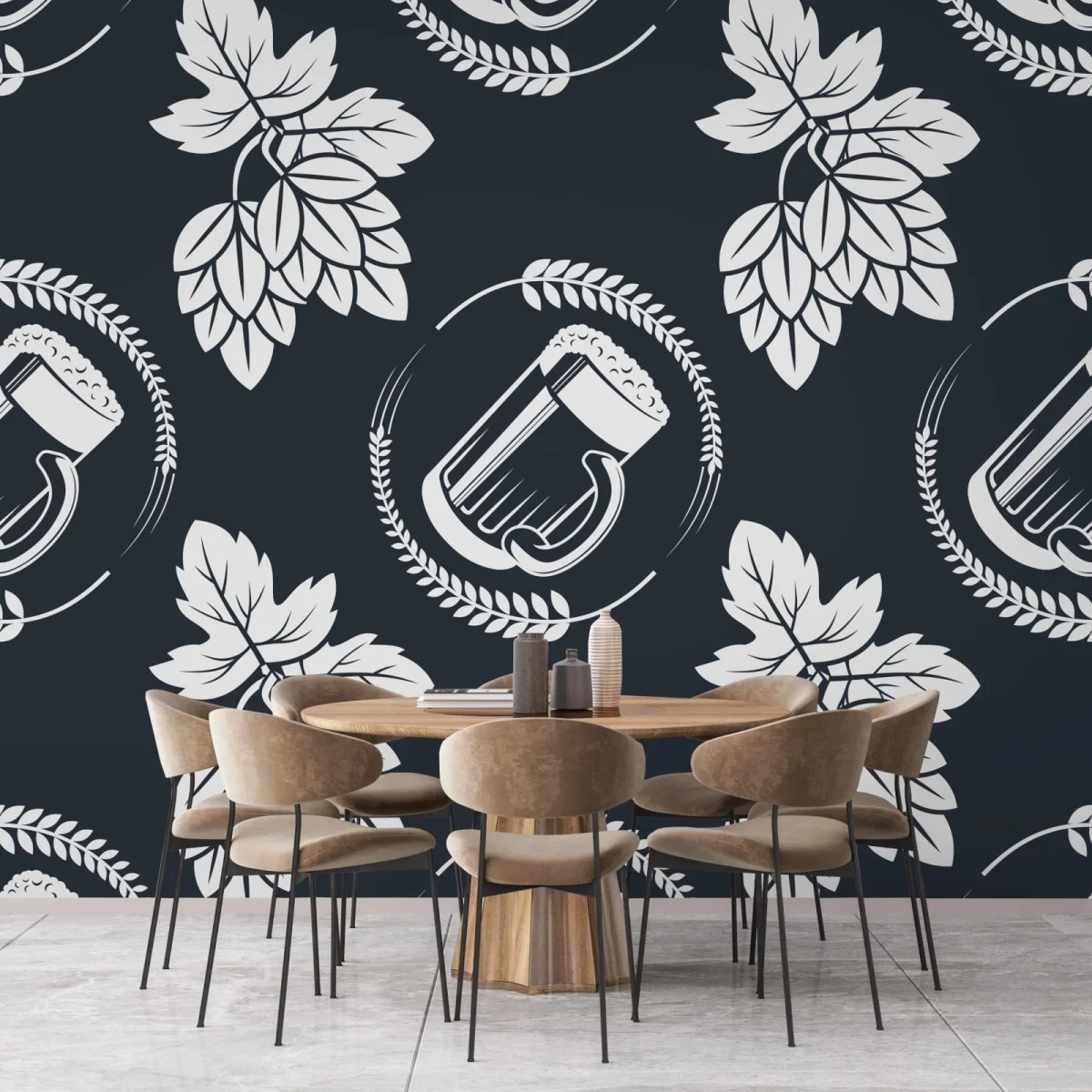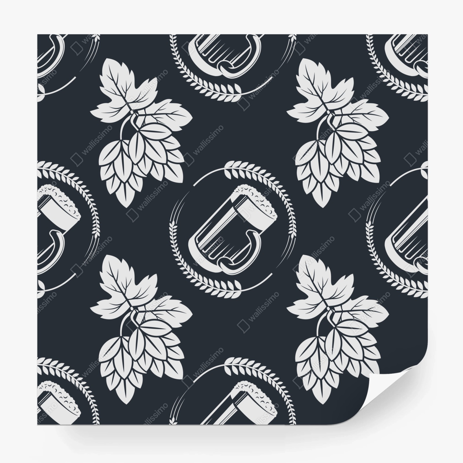 Kräftiges monochromatisches Motiv mit Bier und Hopfen schafft ein stilvolles, retro-inspiriertes Muster, ideal für Küche, Esszimmer oder Hausbar.MehrWeniger