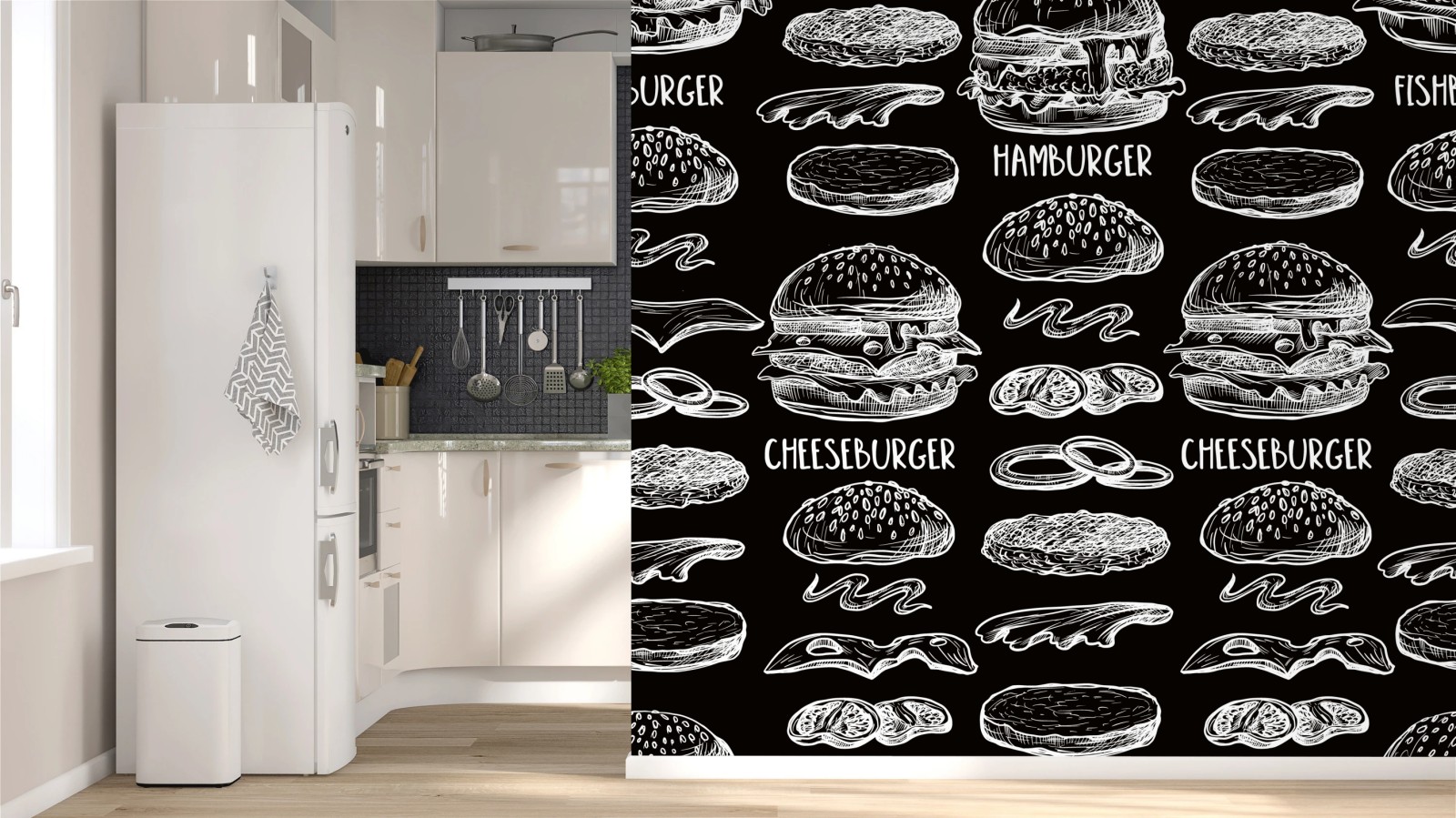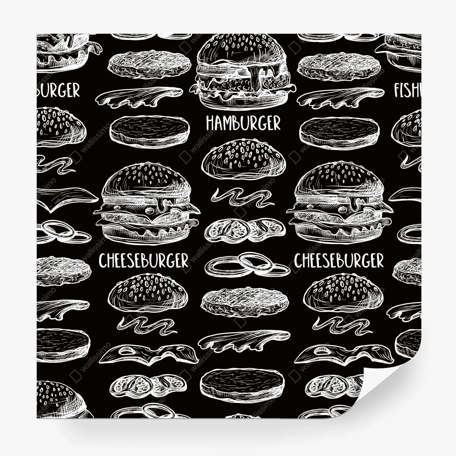 Fototapete Handgezeichnetes burger-muster auf schwarzem hintergrund