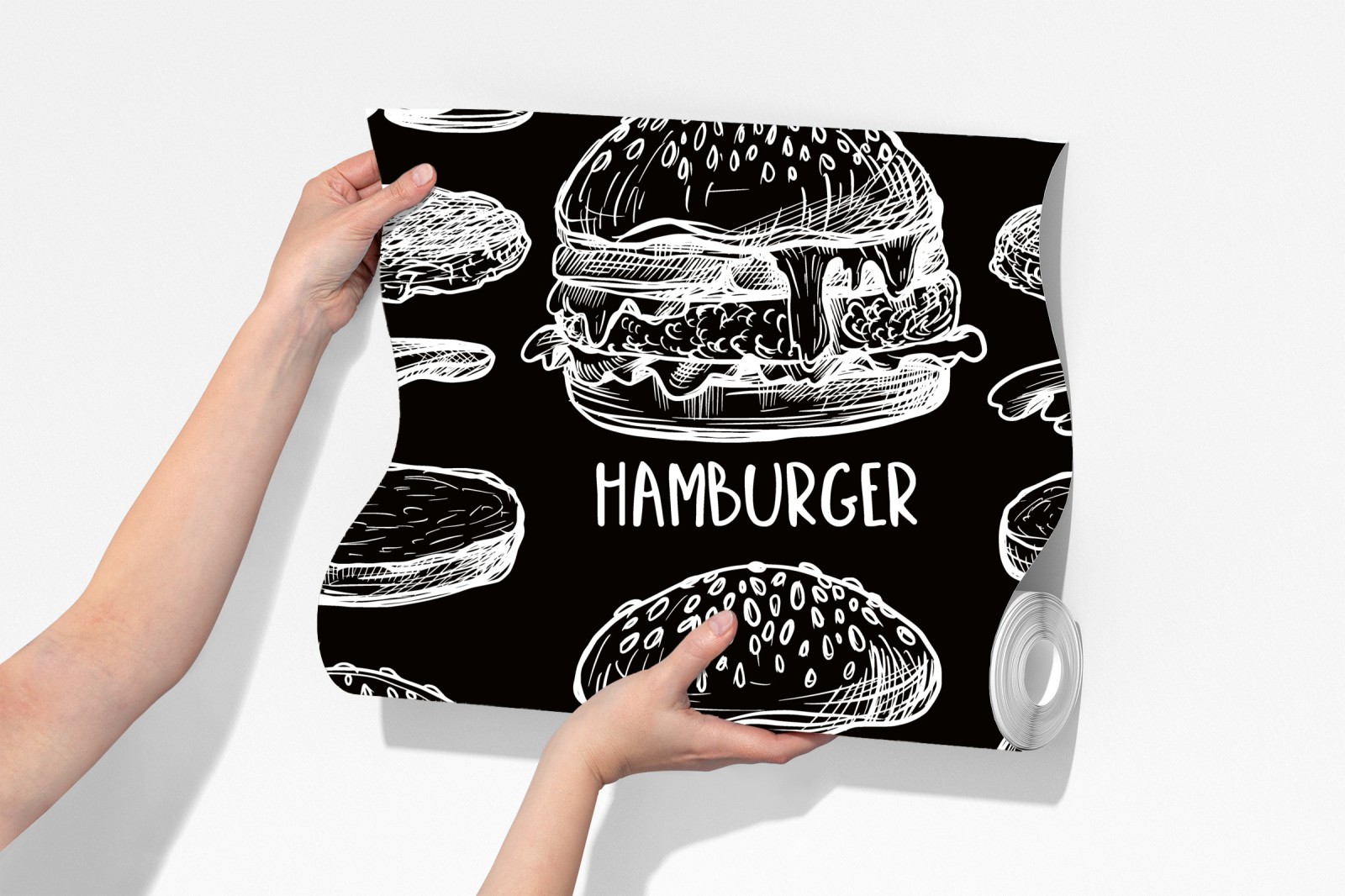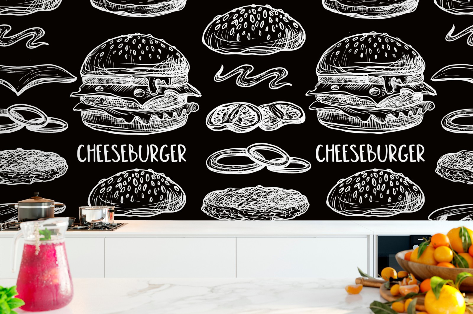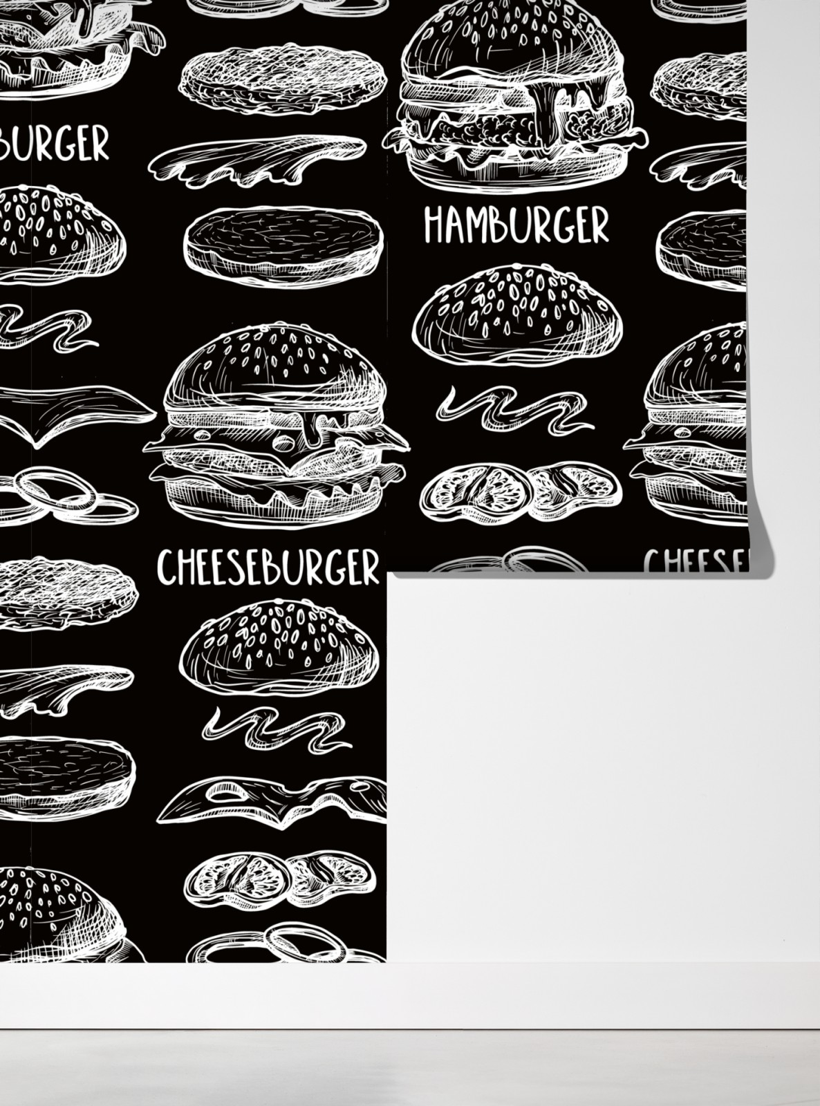 Kräftige schwarz-weiße Burger-Illustrationen schaffen einen verspielten Akzent für Küche, Essbereich oder Restaurantdekoration.