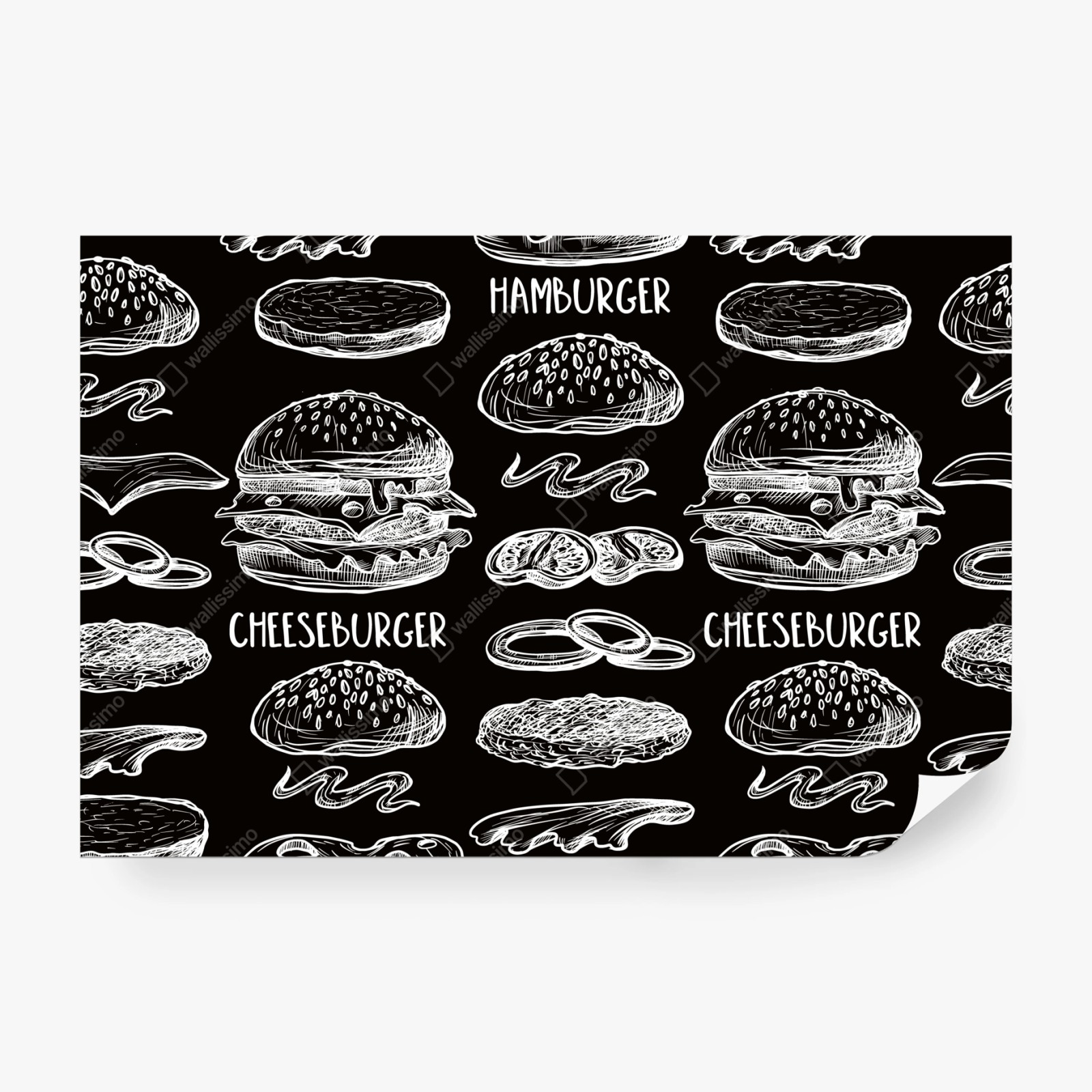 Fototapete Handgezeichnetes burger-muster auf schwarzem hintergrund