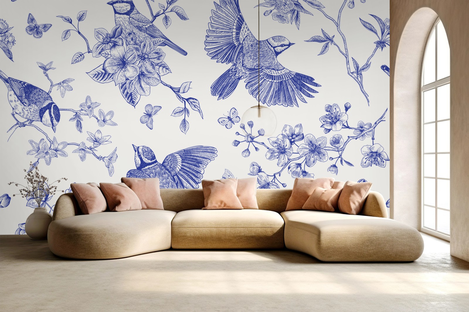 Elegante blaue Illustration von Vögeln und Blumen im Toile-Stil verleiht jedem Raum zeitlosen Charme.MehrWeniger