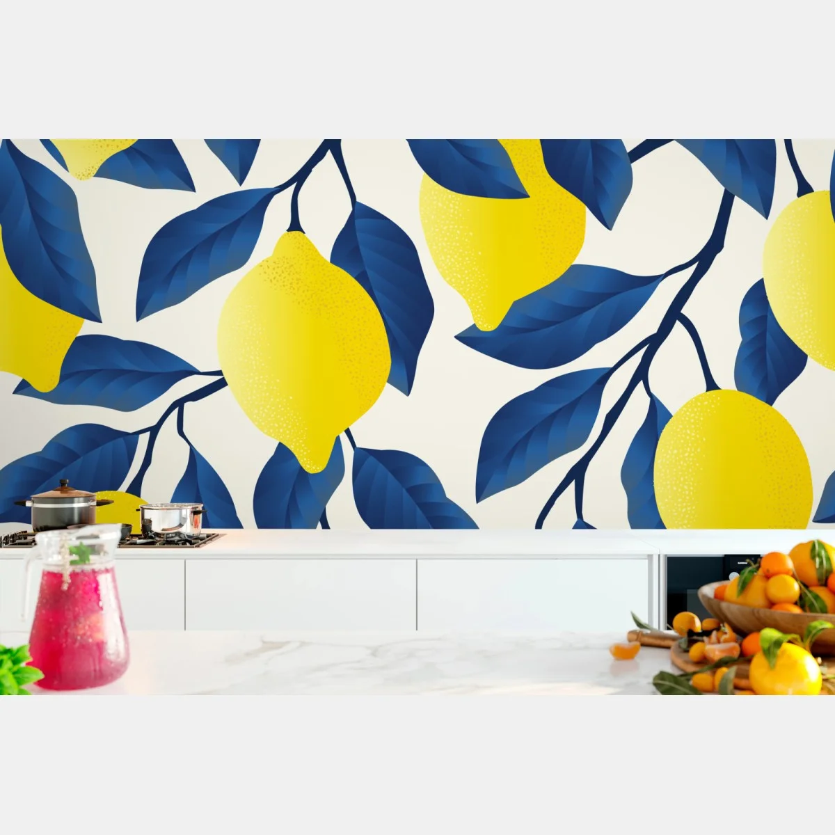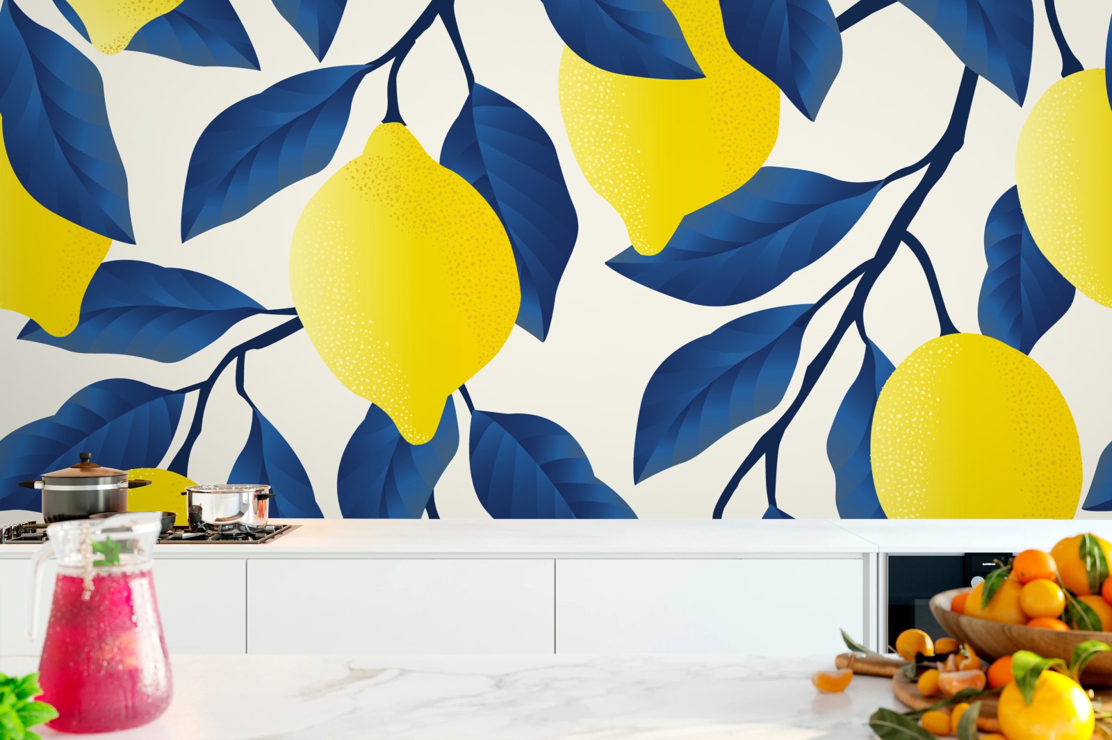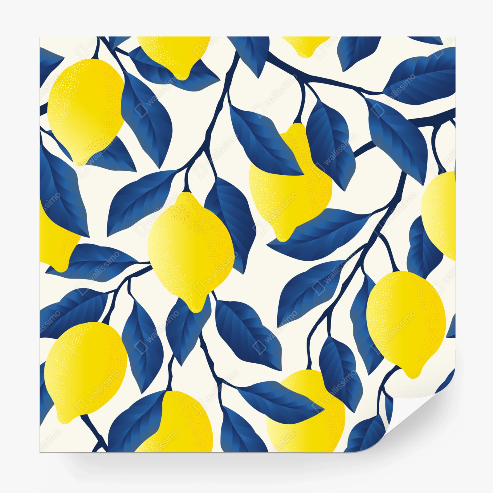 Fototapete Lebhaftes zitronenmuster mit blauen blättern