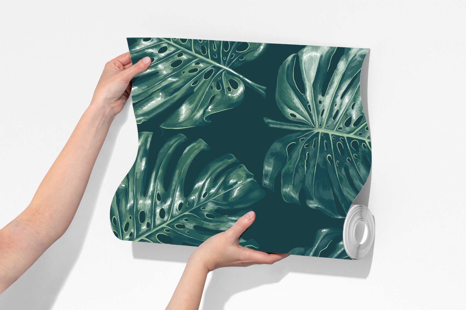 Üppige tropische Monstera-Blätter in einem handgemalten Aquarellmuster bringen beruhigendes Grün und natürliche Atmosphäre in jeden Raum.