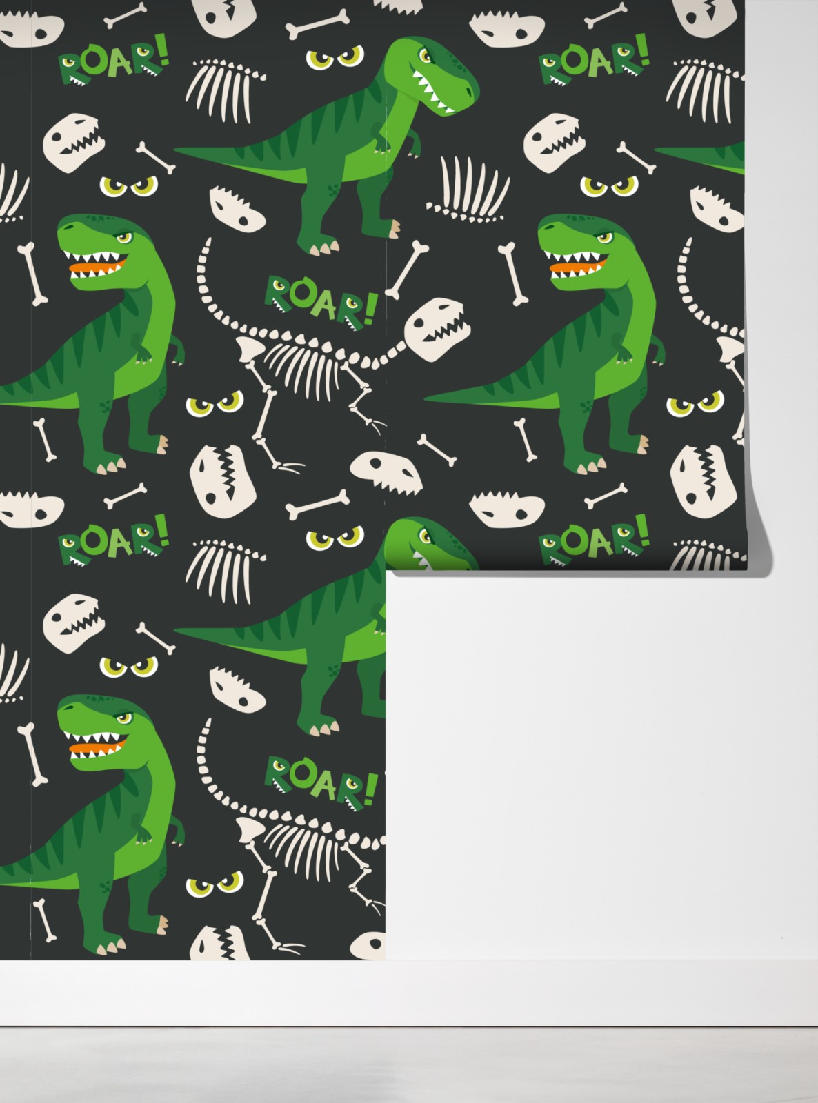 verspieltes cartoon-t-rex und fossilienmotiv in kräftigem grün auf dunklem hintergrund verleiht dem kinderzimmer eine lebhafte, freundliche atmosphäre.
