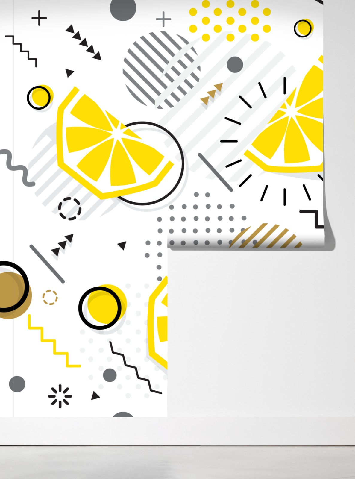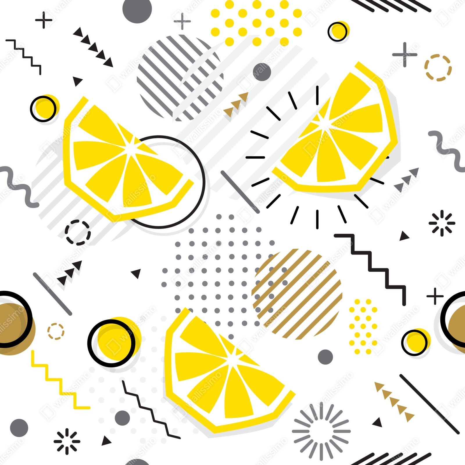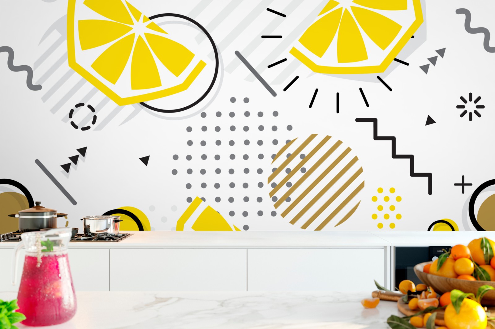 leuchtende zitronenscheiben und geometrische formen ergeben ein modernes, fröhliches design, das küche oder essbereich aufhellt.