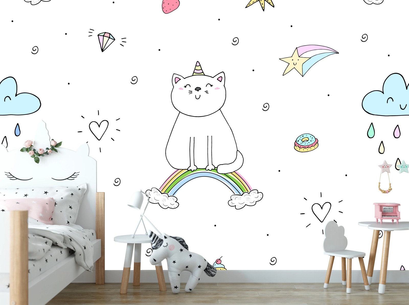 Fototapete Pastell-einhornkatze auf dem regenbogen