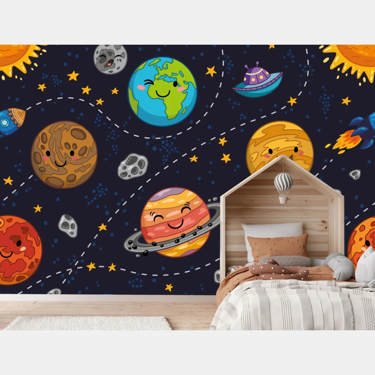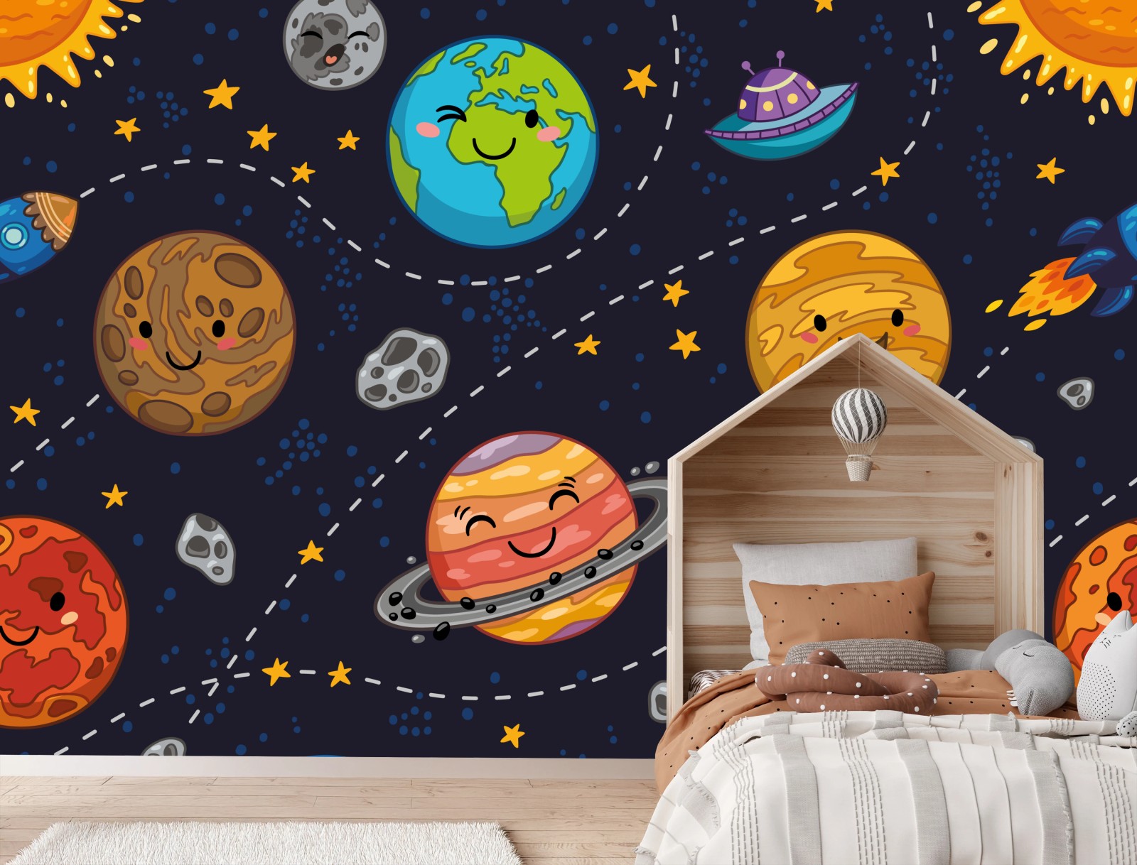 Fototapete Lächelnde planeten im verspielten weltraummuster