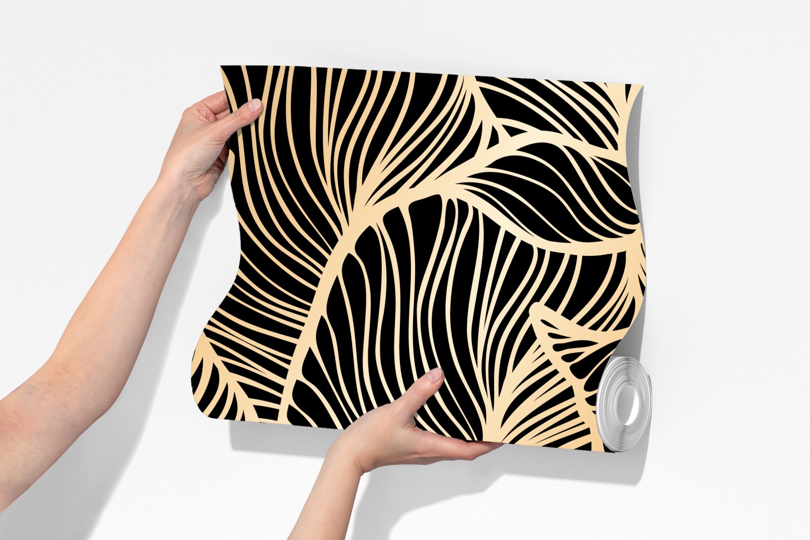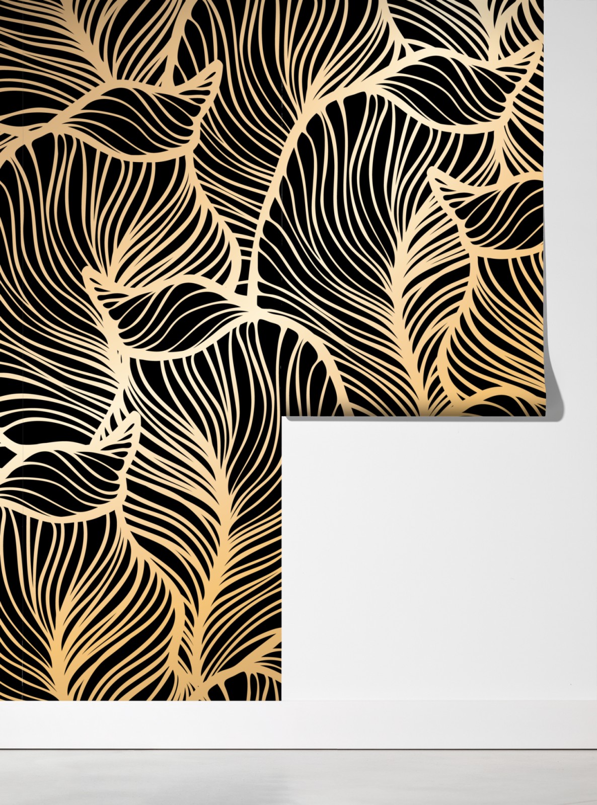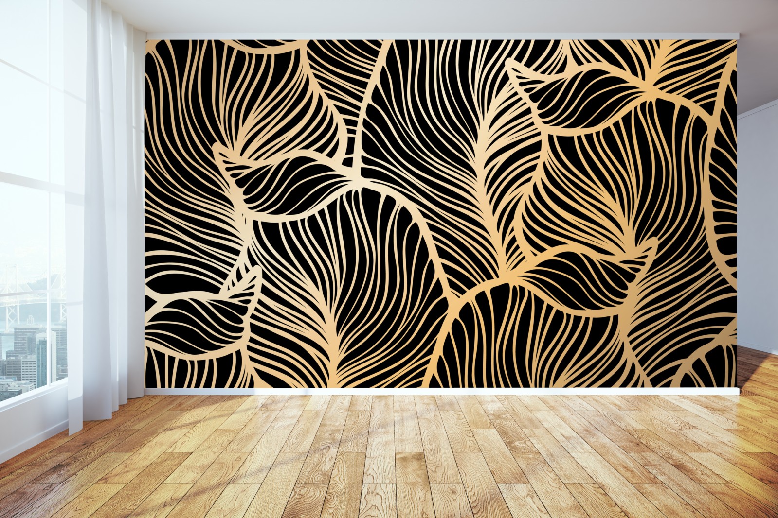 Kräftiges goldenes blattmuster auf tiefschwarzem hintergrund verleiht jedem interieur luxuriöse, moderne eleganz.