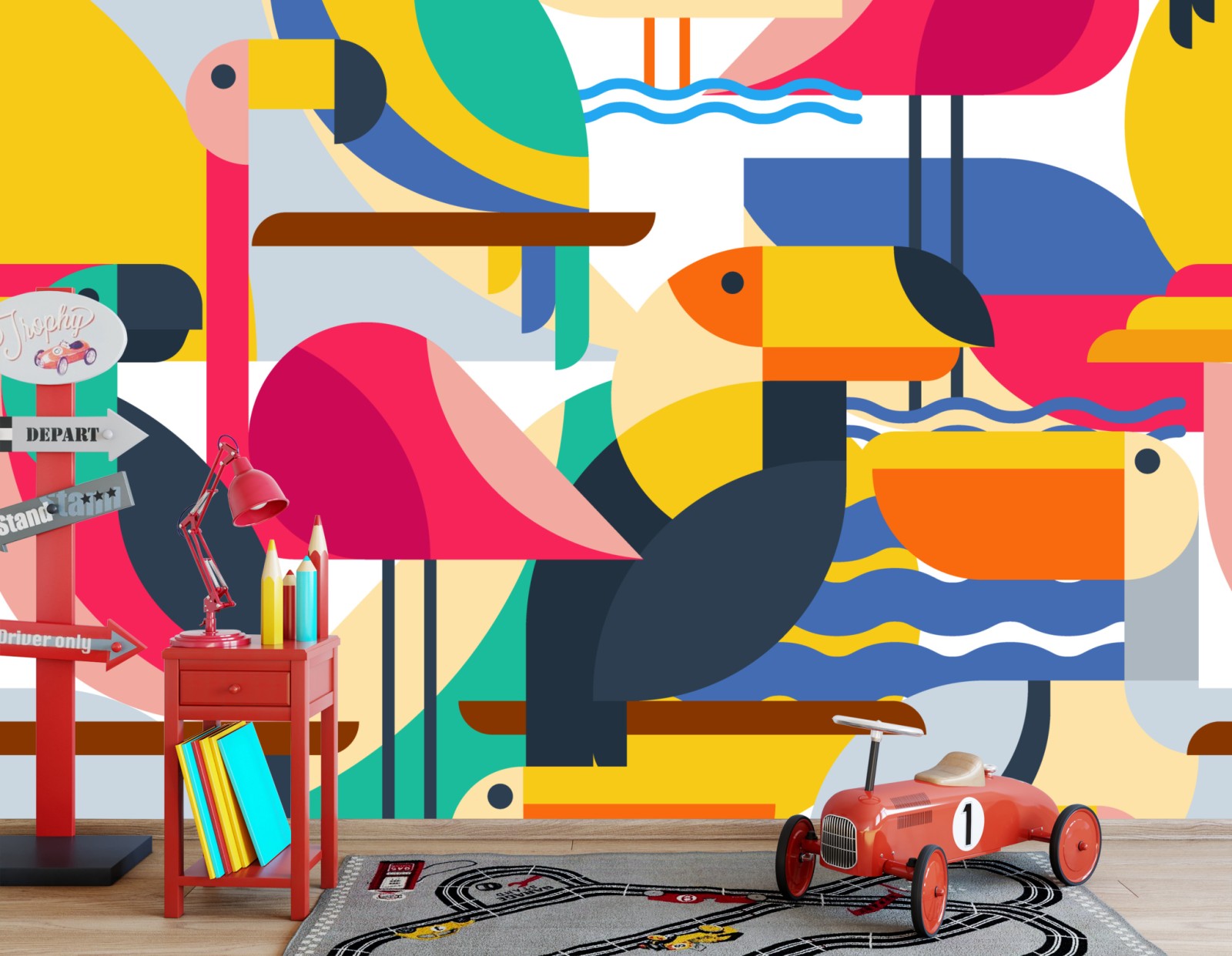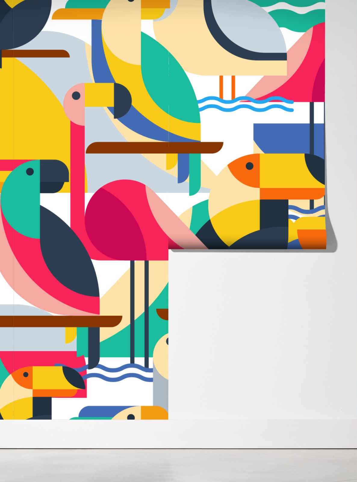 Lebendiges geometrisches Muster tropischer Vögel bringt fröhliche Farben und modernen Charme in jeden Raum.