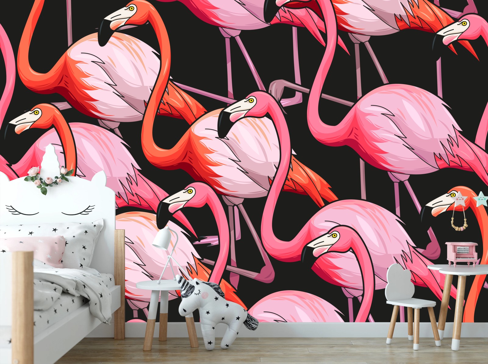 Lebhaftes nahtloses Flamingo-Muster in kräftigen Rosa- und Orange-Tönen auf schwarzem Hintergrund, perfekt für verspielte und tropisch inspirierte Wohnräume.MehrWeniger