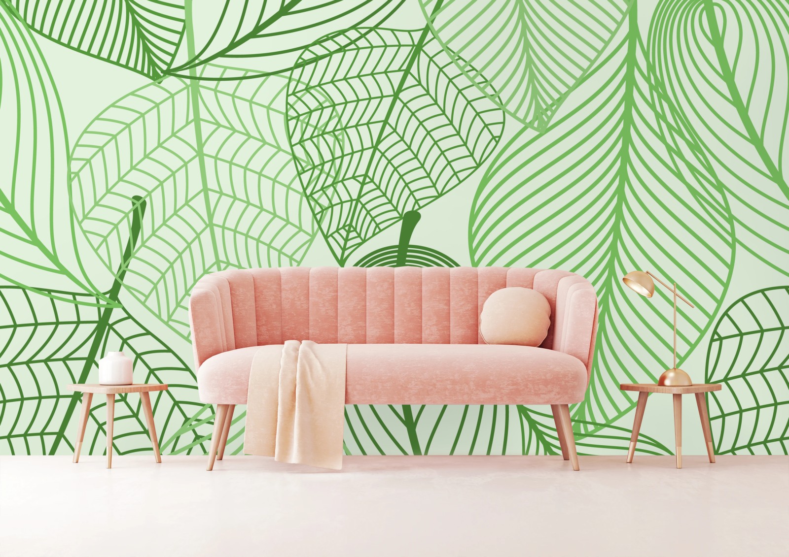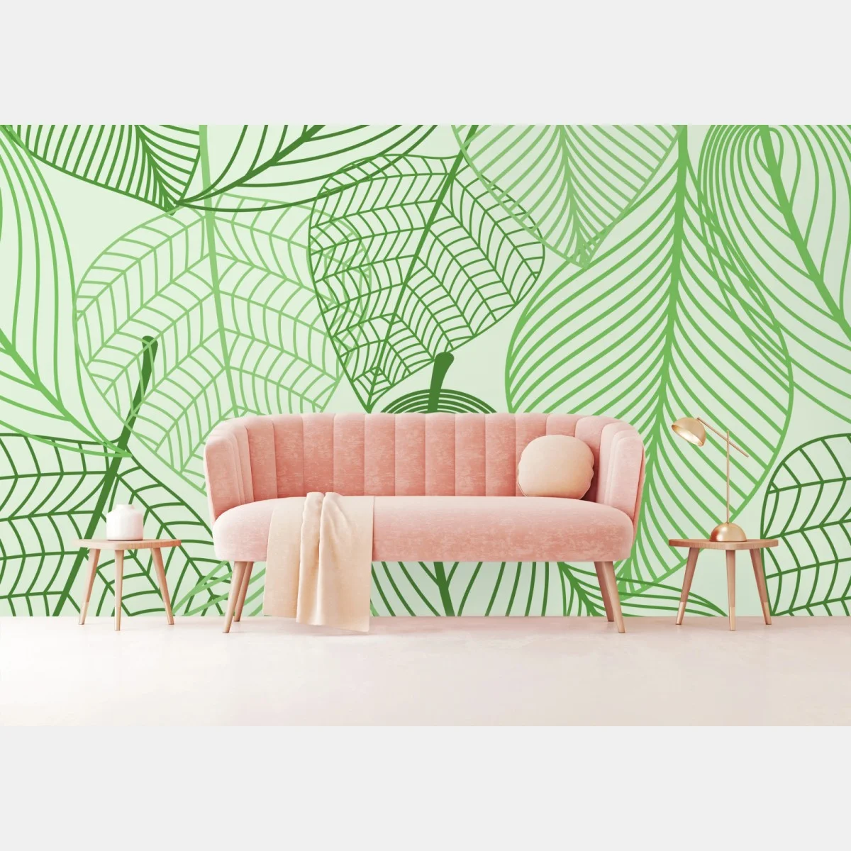 das frische grüne blättermuster bringt eine beruhigende botanische atmosphäre in jeden raum und schafft ein natürliches ambiente.MehrWeniger