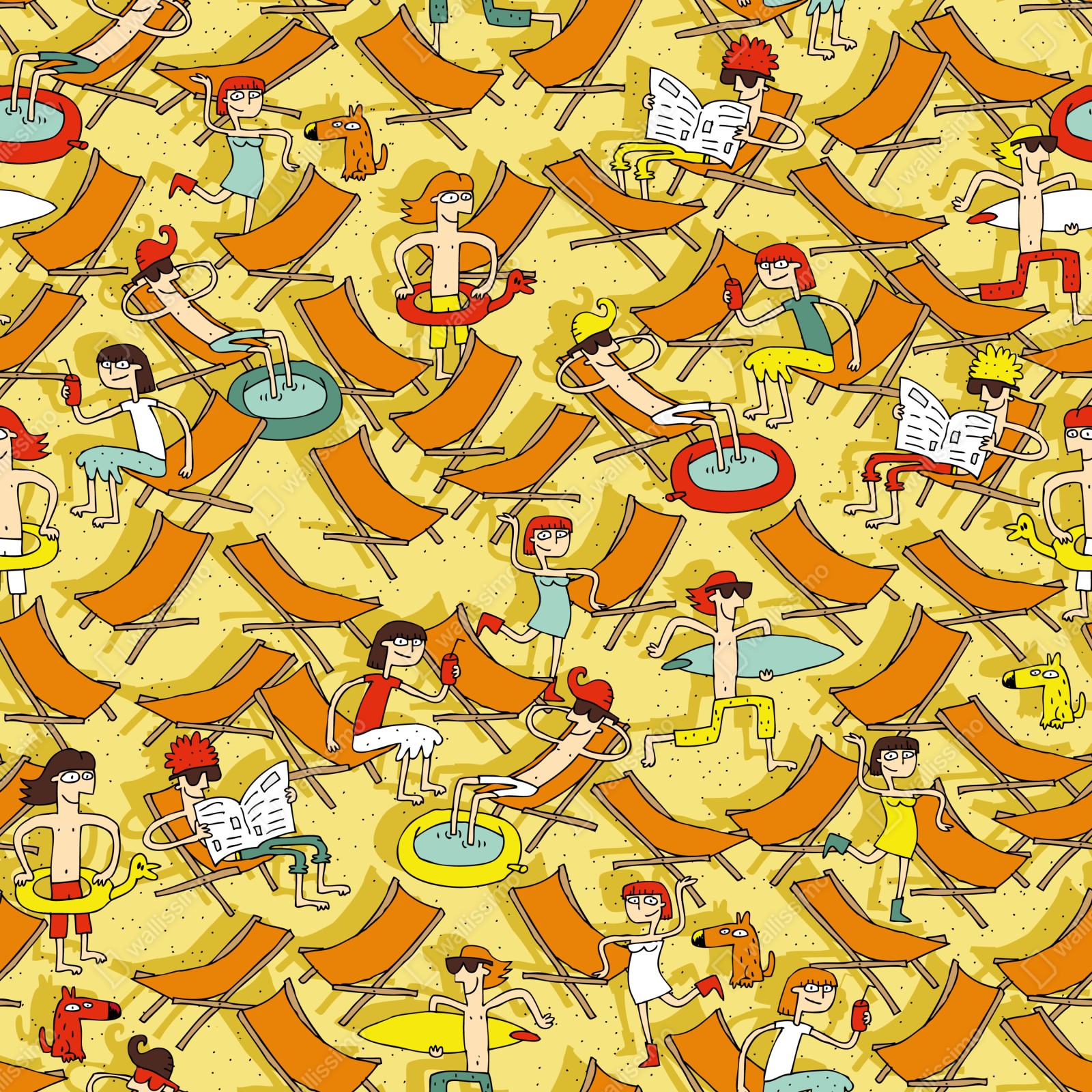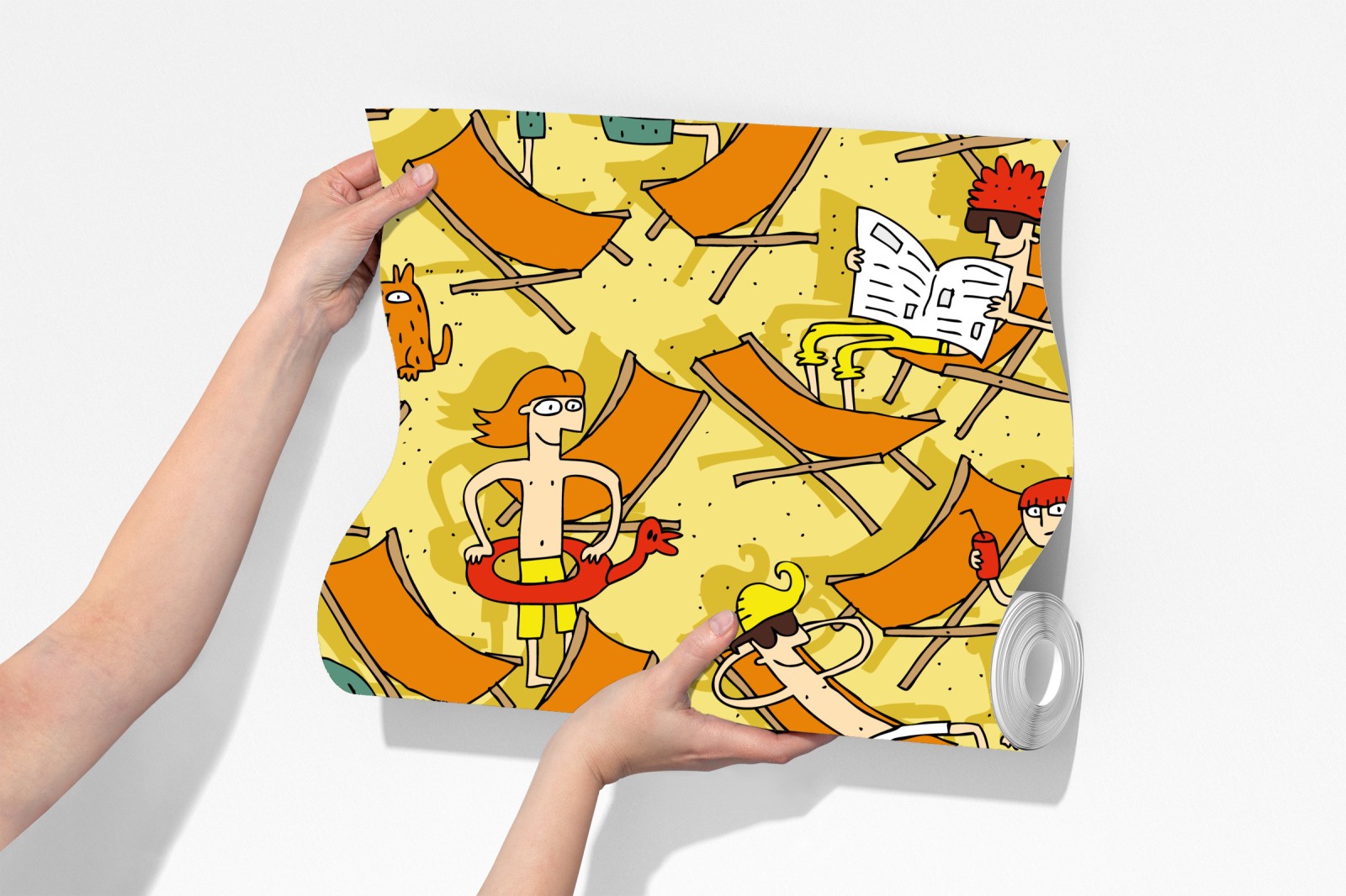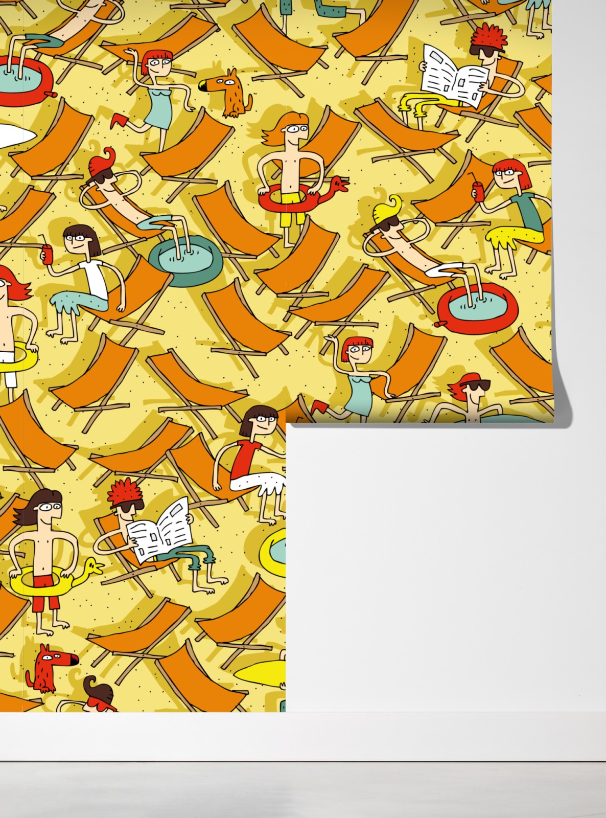 Helles, verspieltes Strandmuster mit Sonnenbadenden, Liegestühlen und sommerlicher Stimmung — perfekt, um jedem Raum eine fröhliche Note zu verleihen.