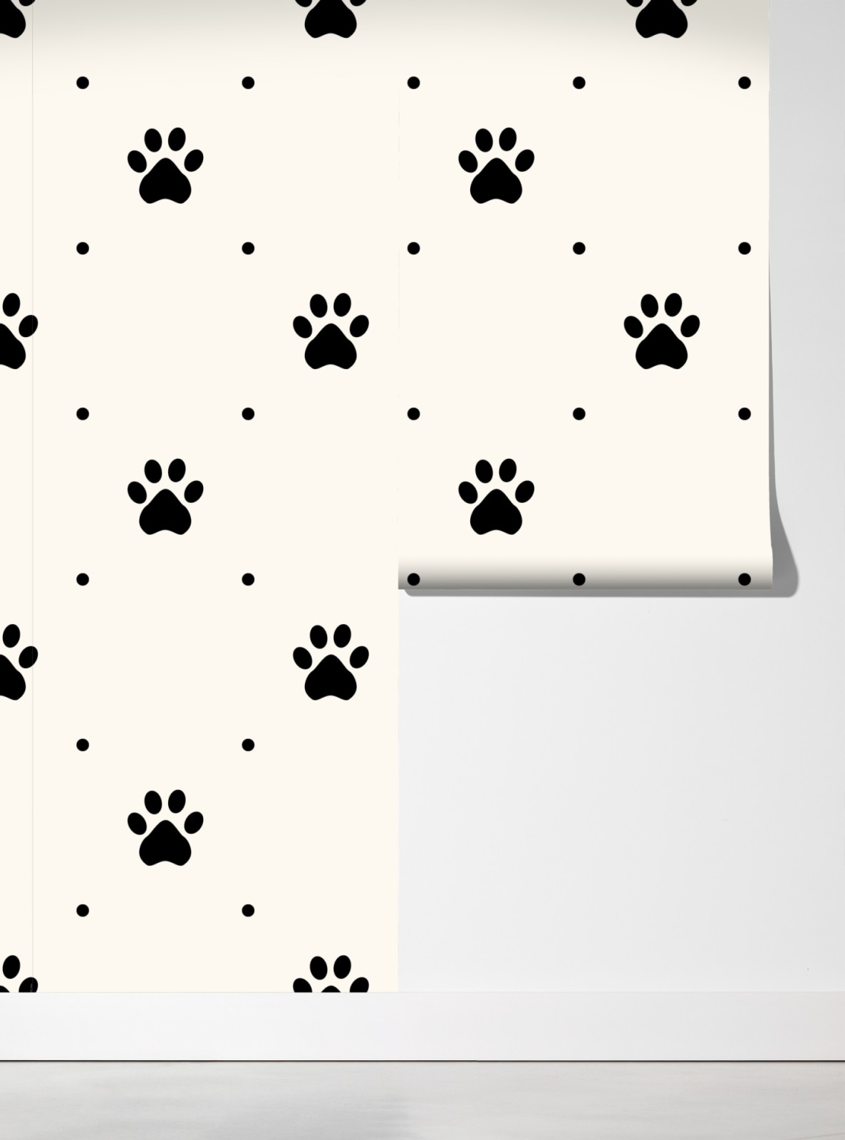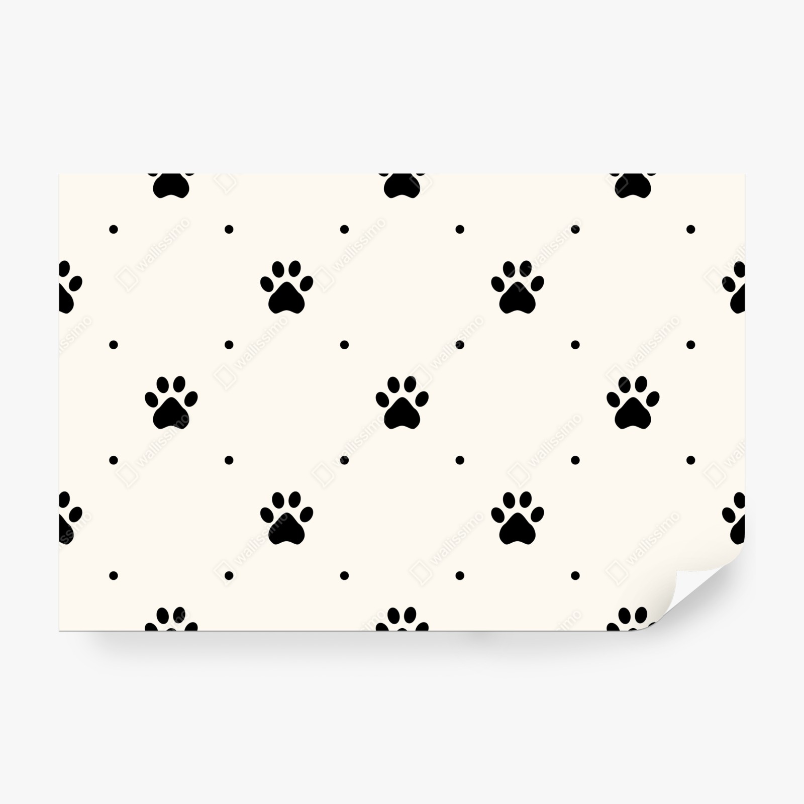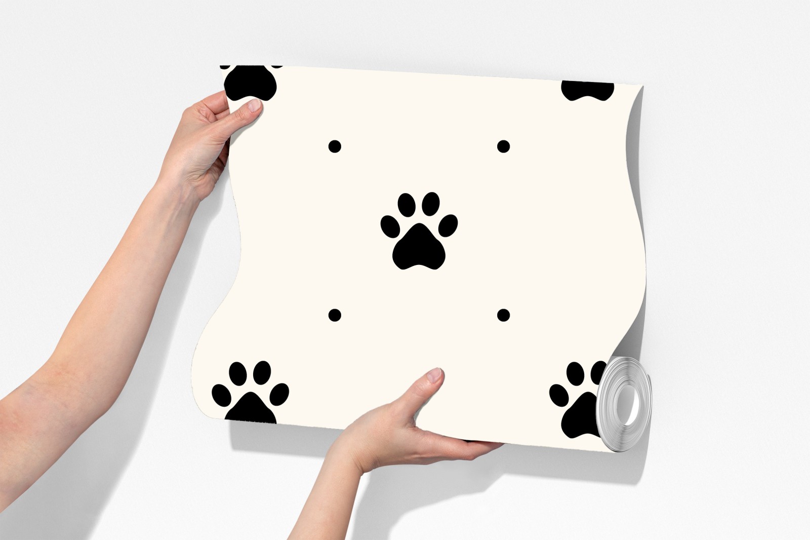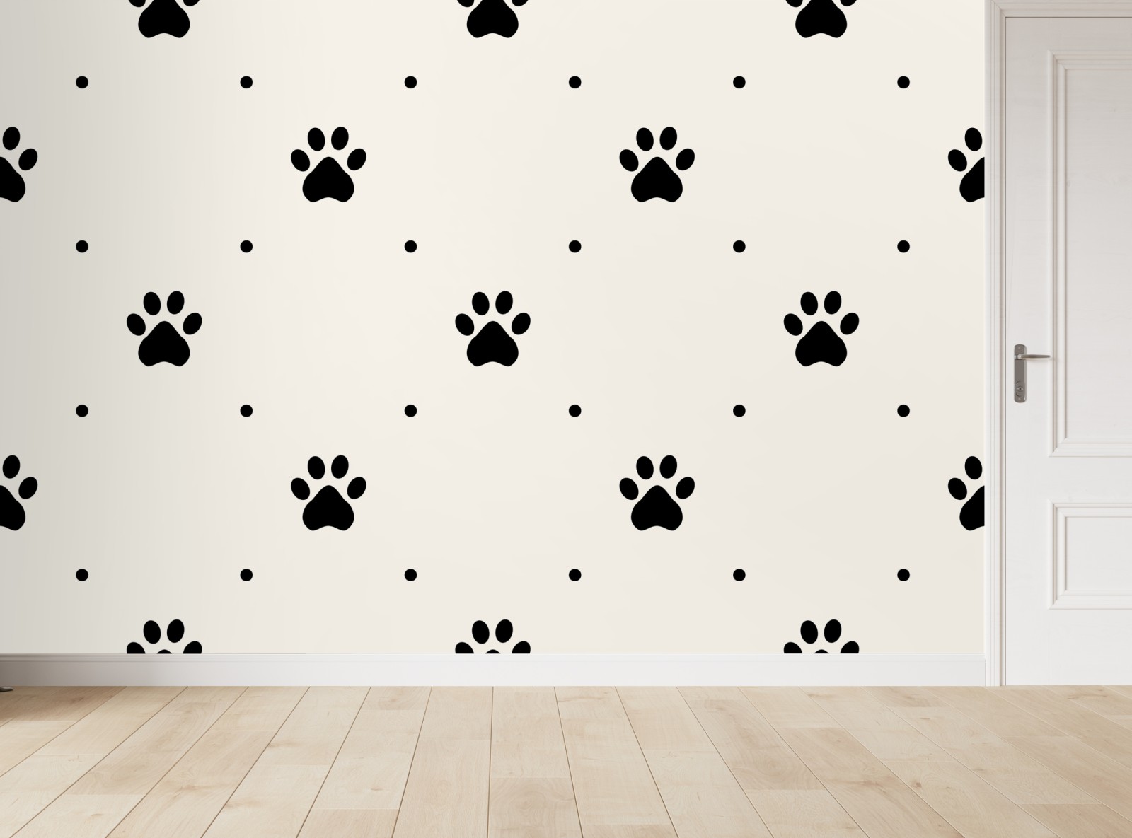 Charmantes nahtloses Muster mit schwarzen Pfoten auf warmem beigem Hintergrund, ideal für Kinderzimmer und haustierfreundliche Räume.