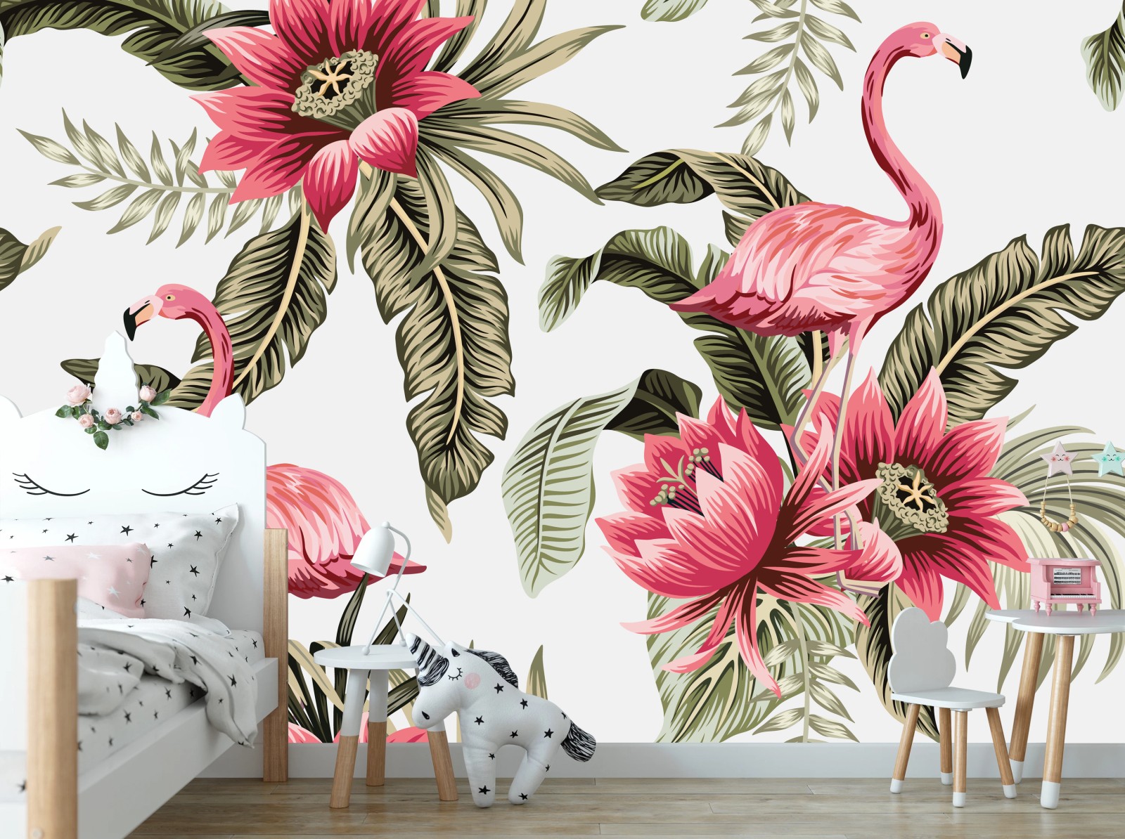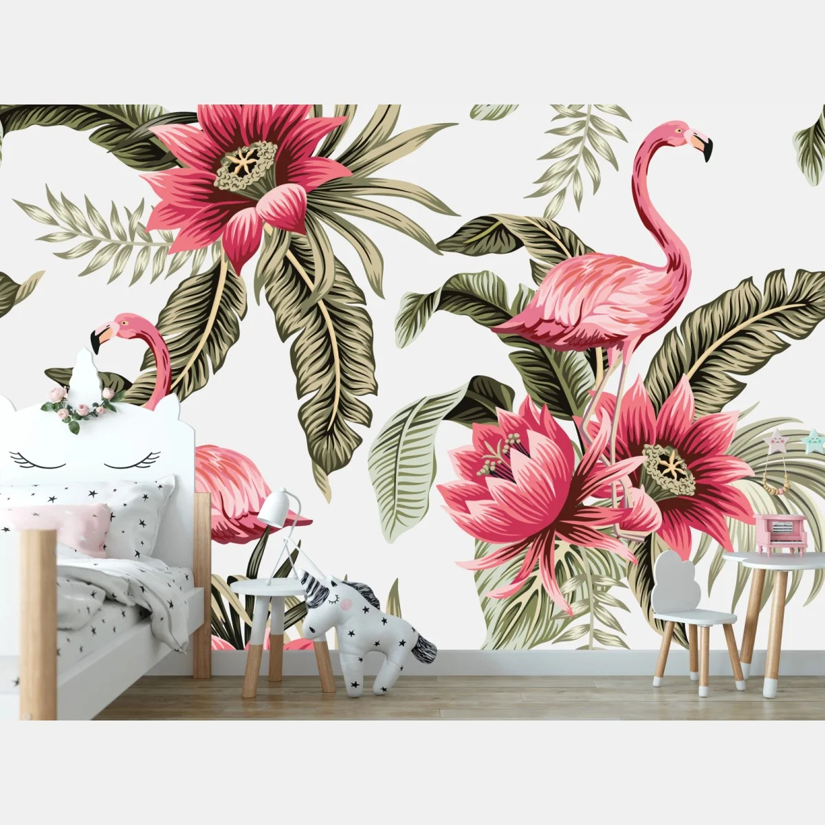 lebendiges tropisches design mit rosa flamingos und üppigen botanischen blüten, perfekt um jedem raum einen verspielten, exotischen akzent zu verleihen.MehrWeniger