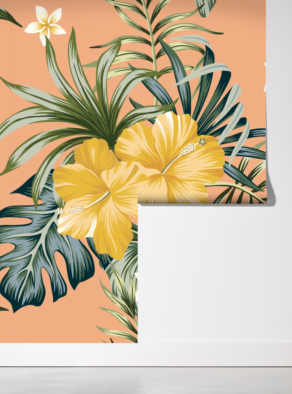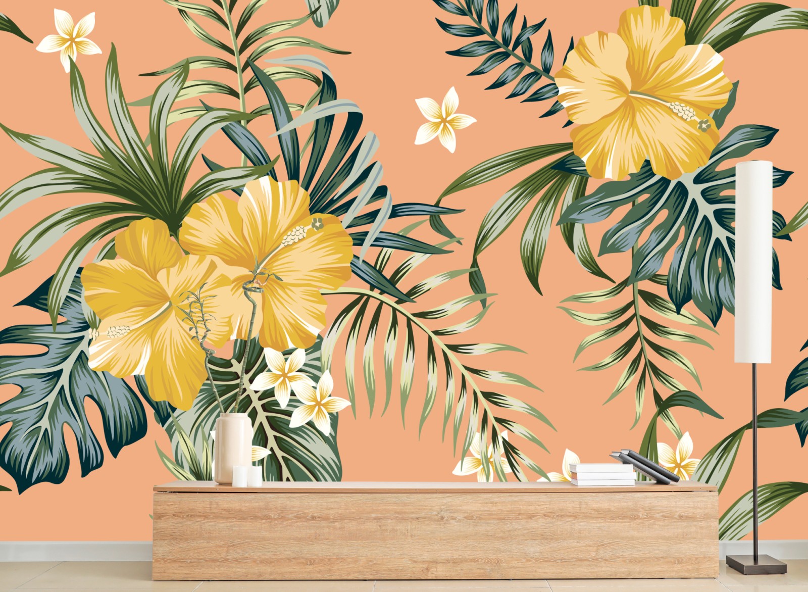 Fototapete tropisches hibiskusmuster auf pfirsichfarbenem hintergrund