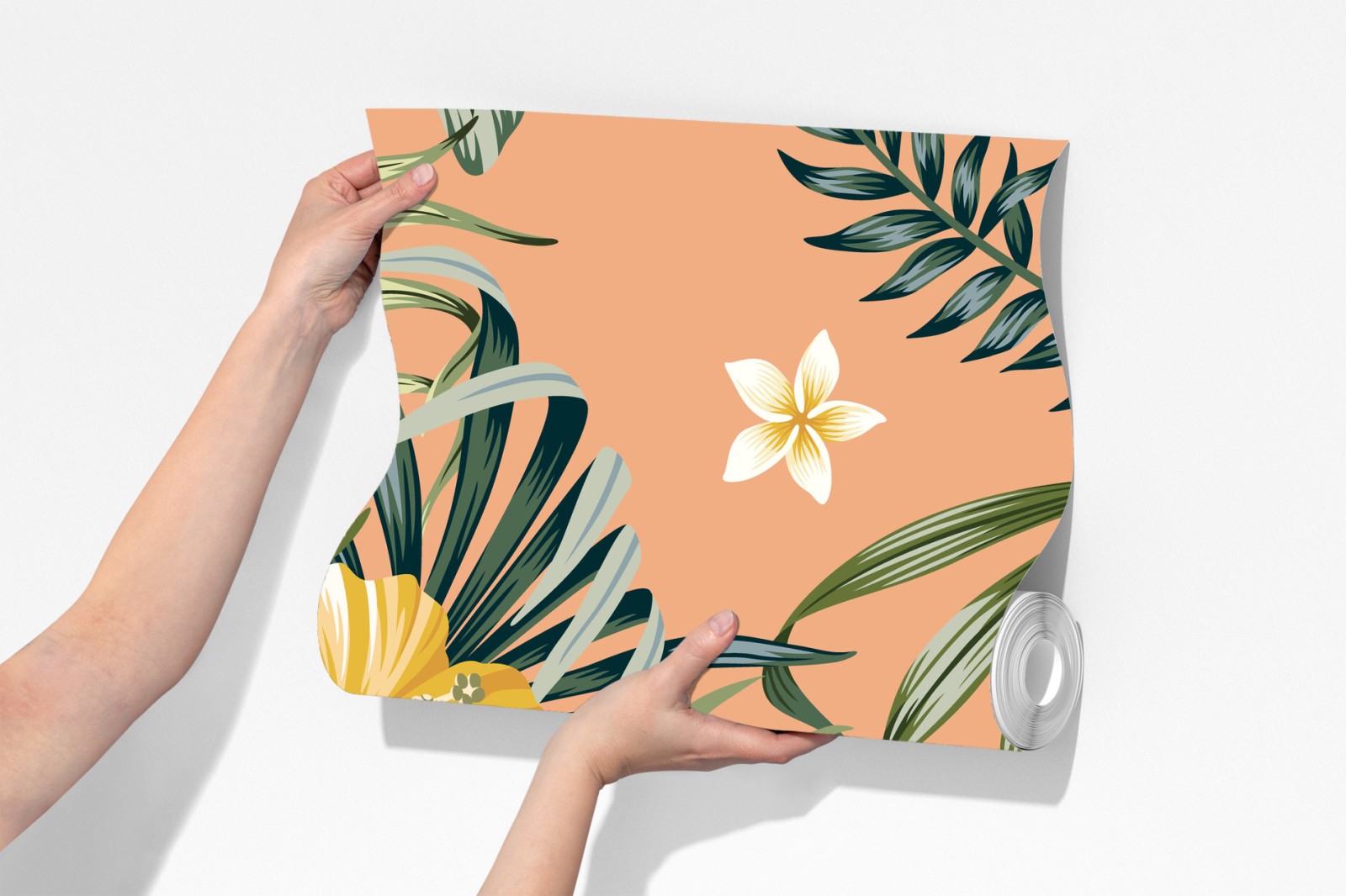 bringen sie tropisches flair in ihr zuhause mit diesem lebendigen hibiskus- und plumeria-motiv auf sanftem pfirsichfarbenem hintergrund.