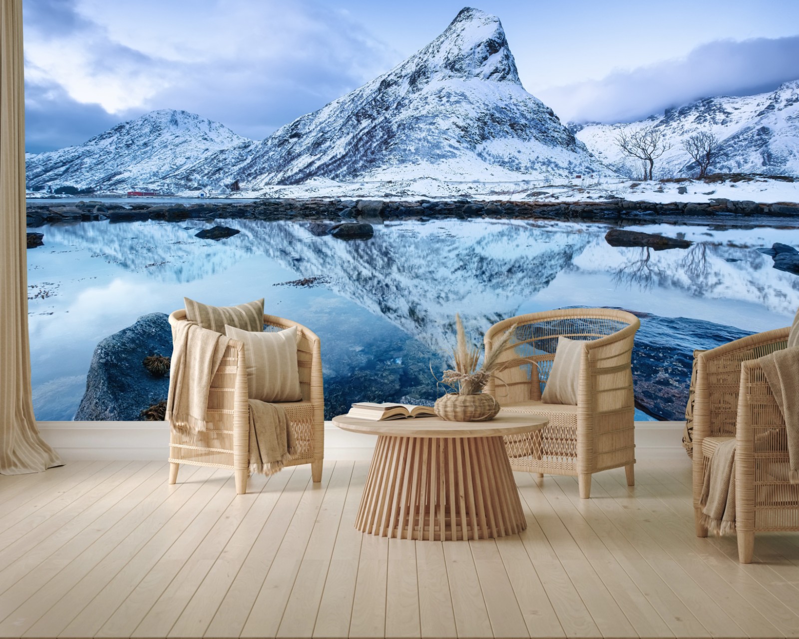 Fototapete Schneebedeckter berg gespiegelt auf ruhigem wasser, Norwegen