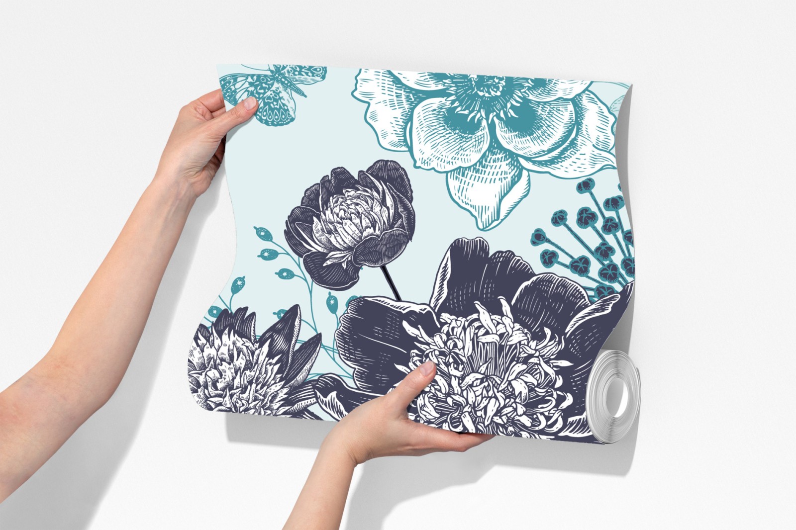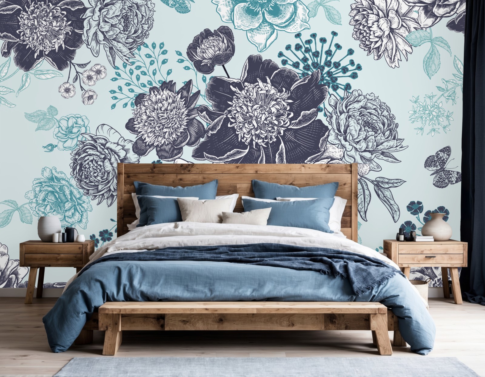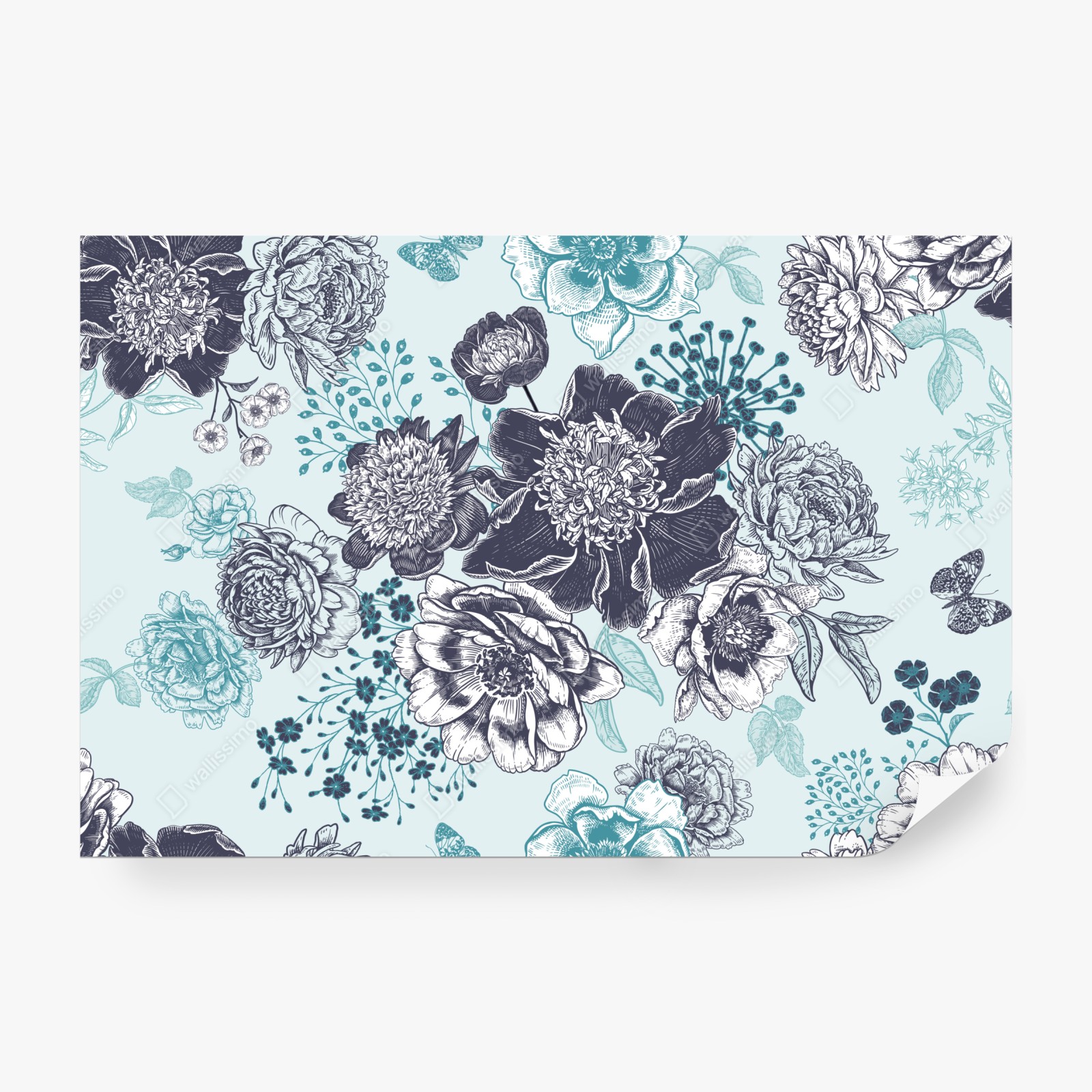 Fototapete blumiges peonienmuster in türkis und marineblau – Wallnifity®