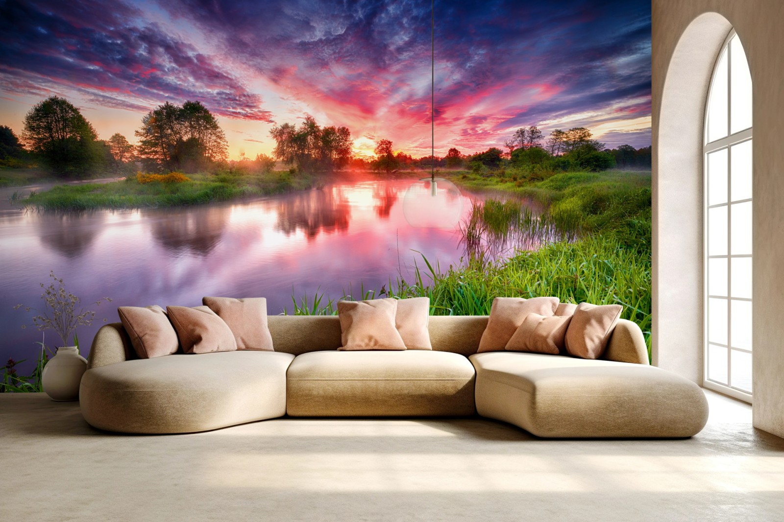Fototapete Ruhiger sommer sonnenaufgang am flussufer