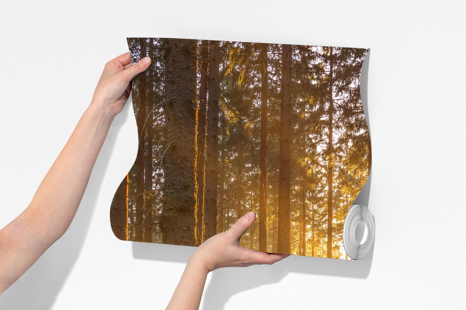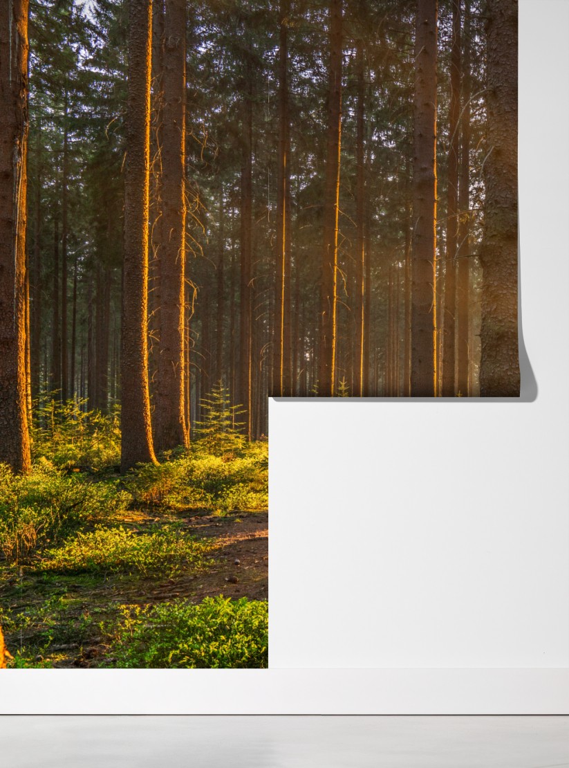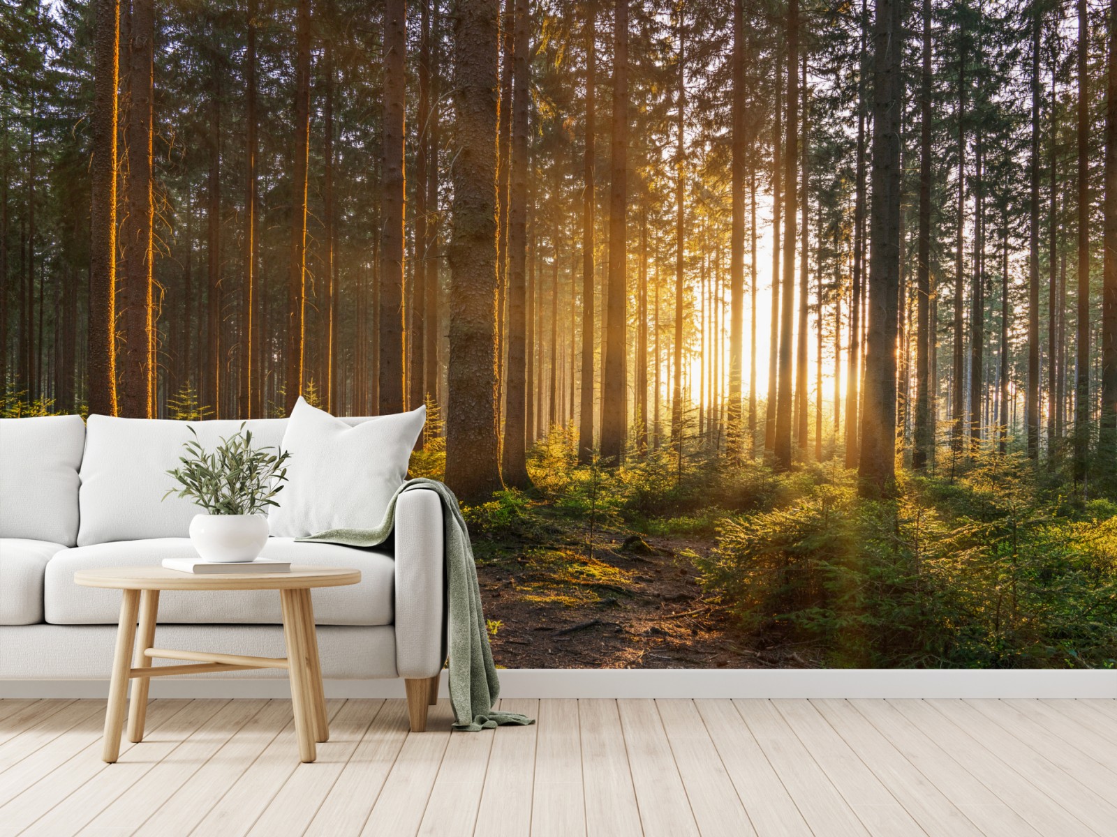 Eine ruhige, sonnendurchflutete Waldszene mit warmen Strahlen zwischen hohen Kiefern, ideal um natürliche Ruhe ins Zuhause zu bringen.