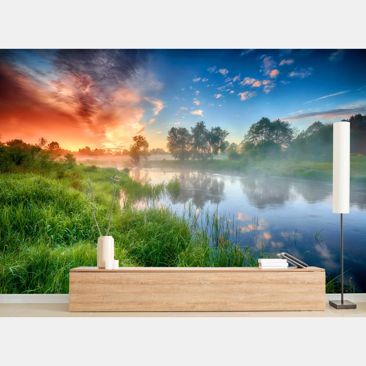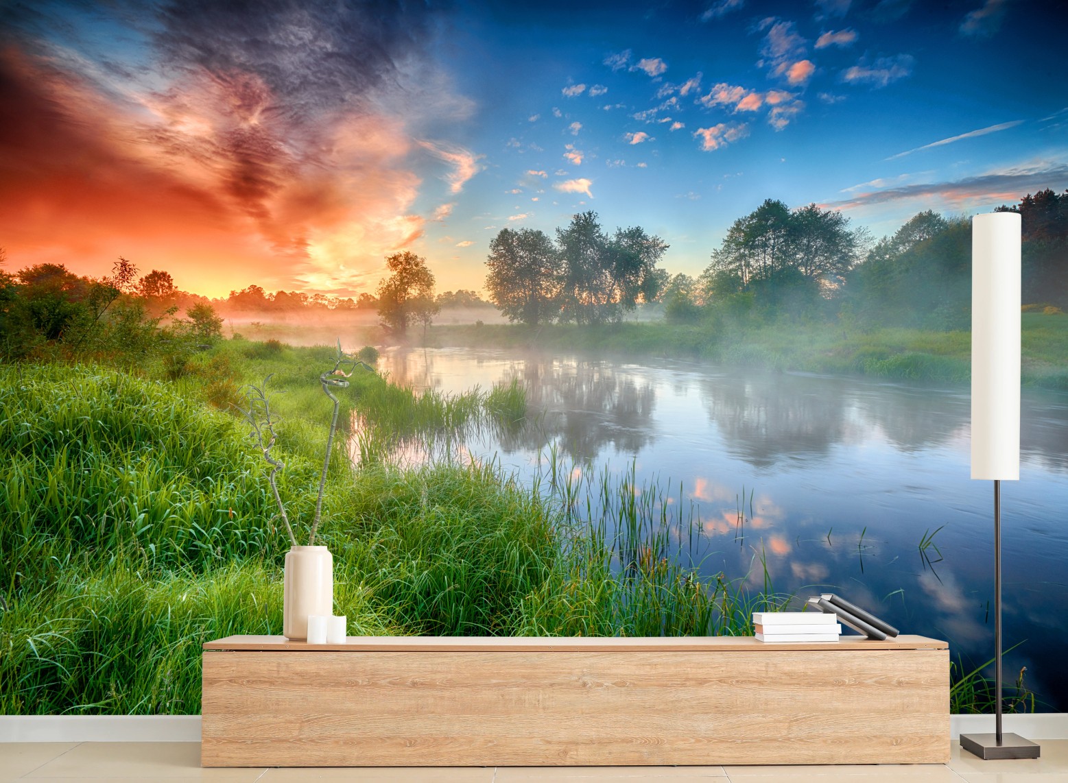 Fototapete Nebel bei sonnenaufgang am flussufer