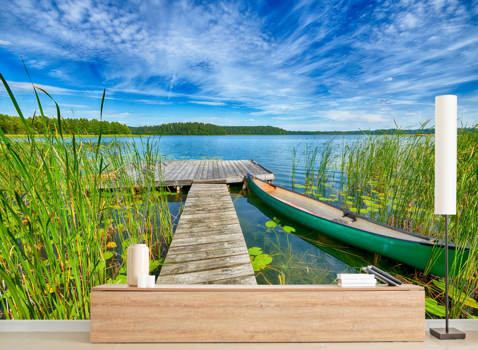 Heller Sommerblick auf einen ruhigen Masurensee mit Holzsteg und Kanu, ideal um natürliche Ruhe in Ihr Zuhause zu bringen.