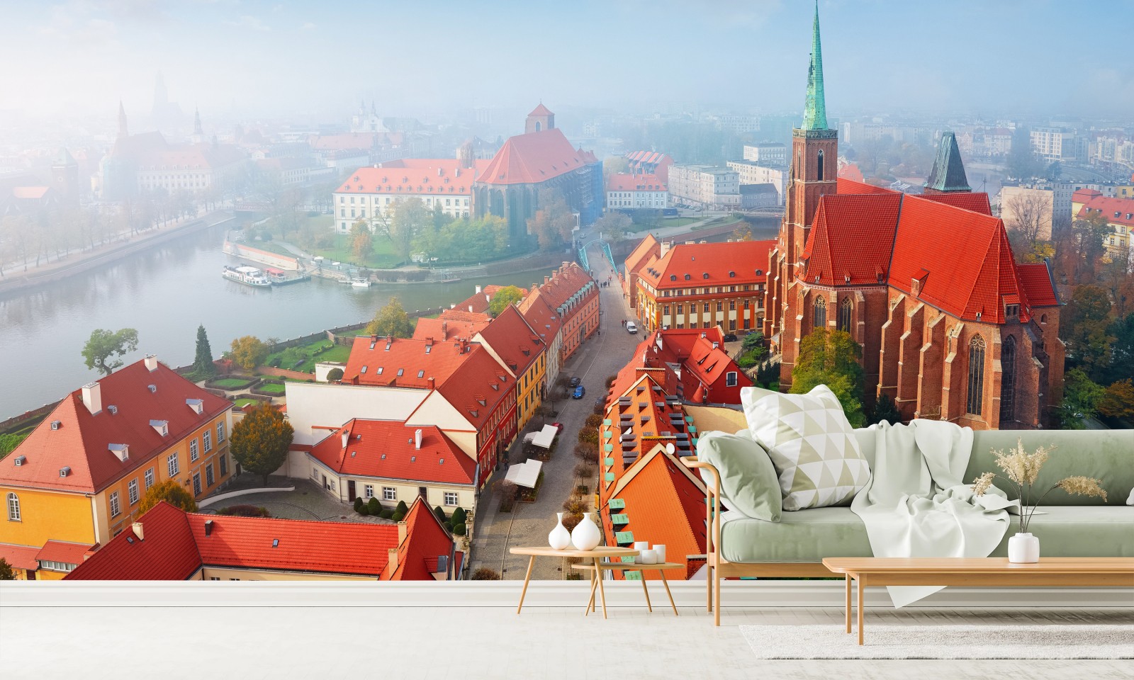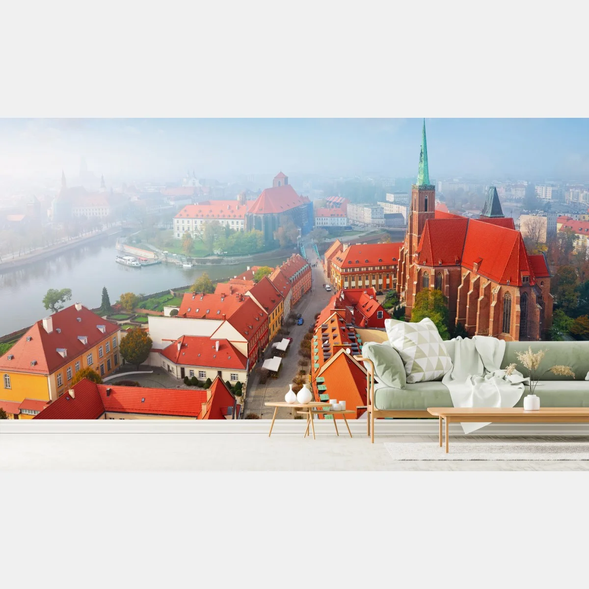Fototapete Neblige europäische stadtszene mit roten dächern