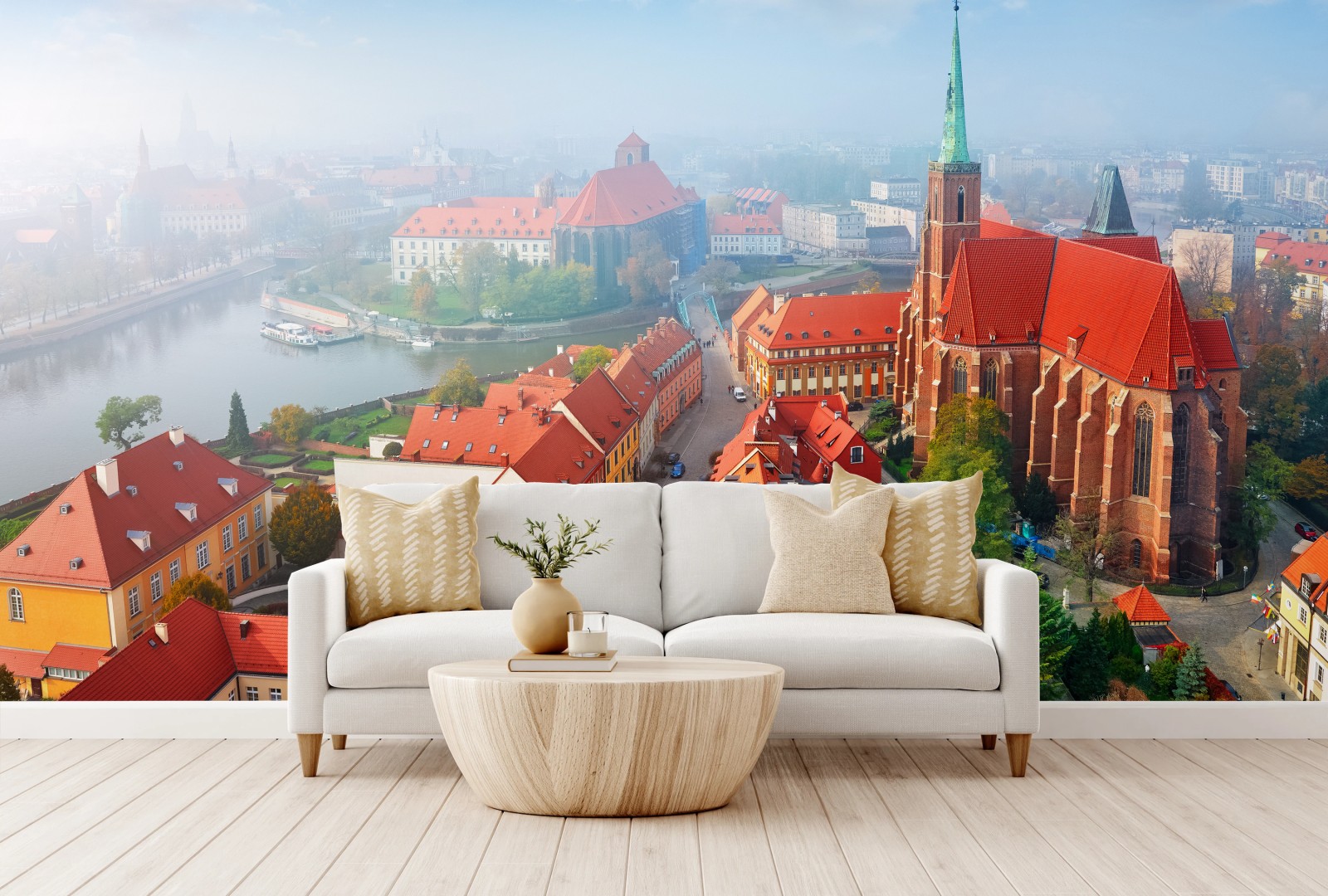Fototapete Neblige europäische stadtszene mit roten dächern