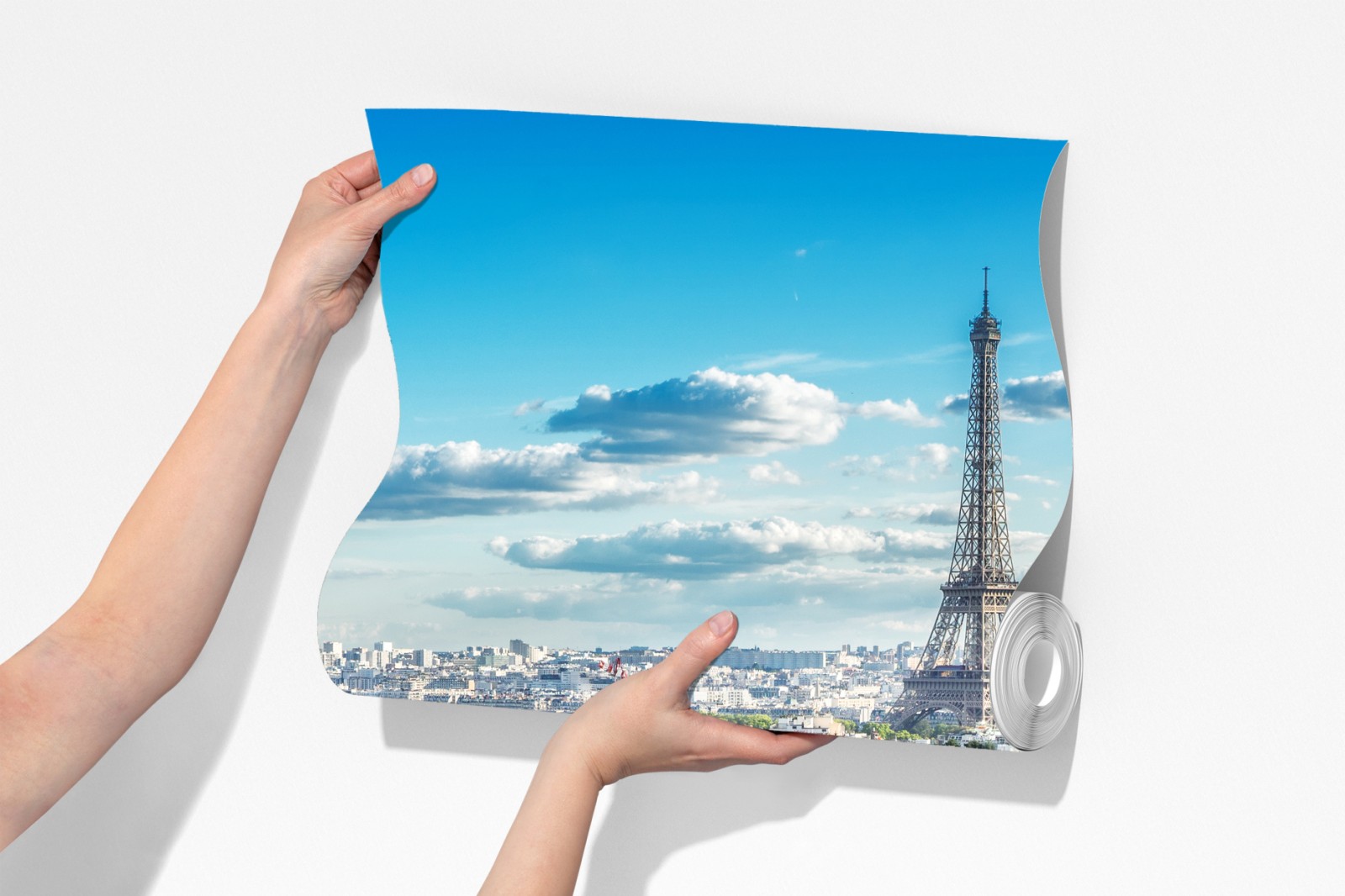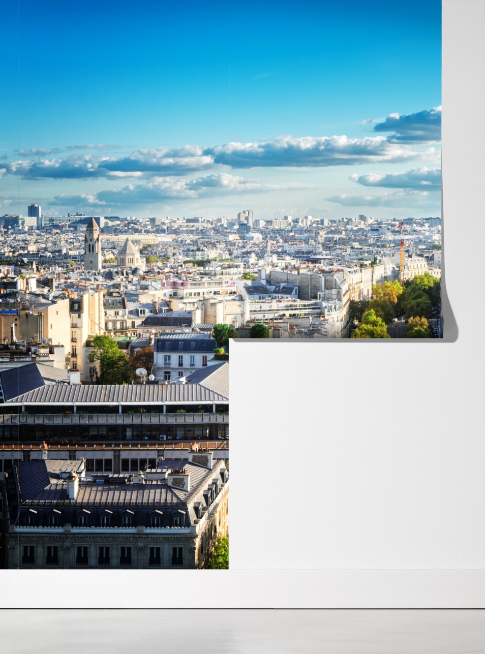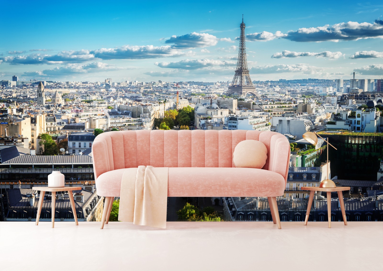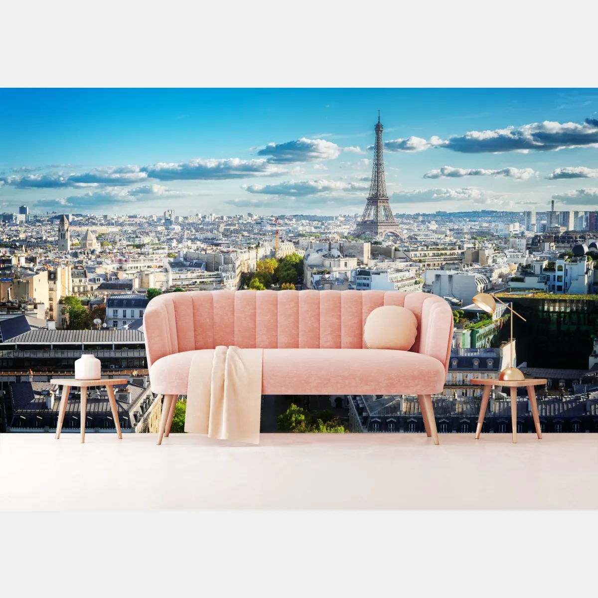 Beeindruckende Panoramaaufnahme von Paris mit dem Eiffelturm und sonnenbeschienenen Dächern, die urbanen Charme in jeden Raum bringt.