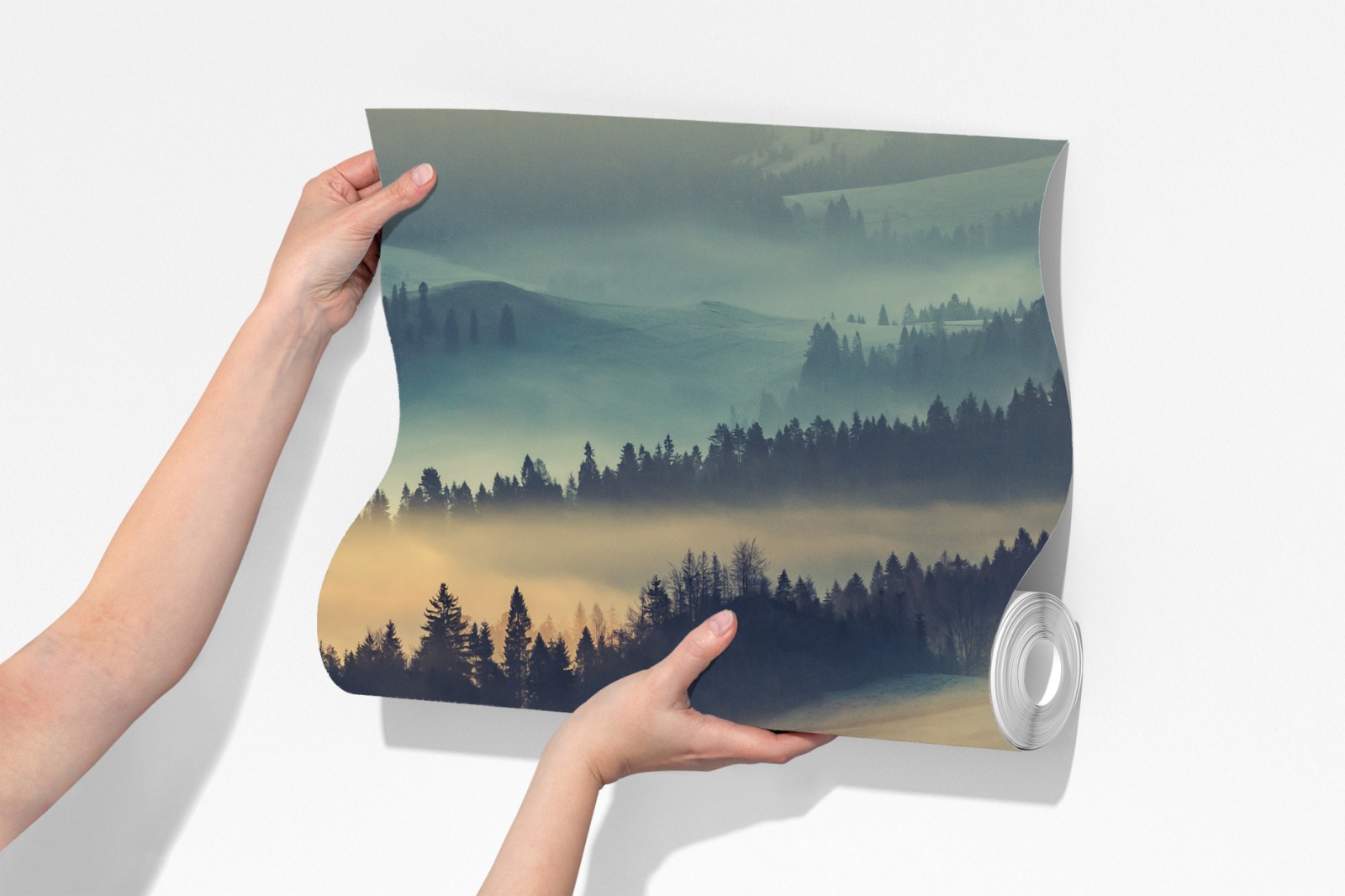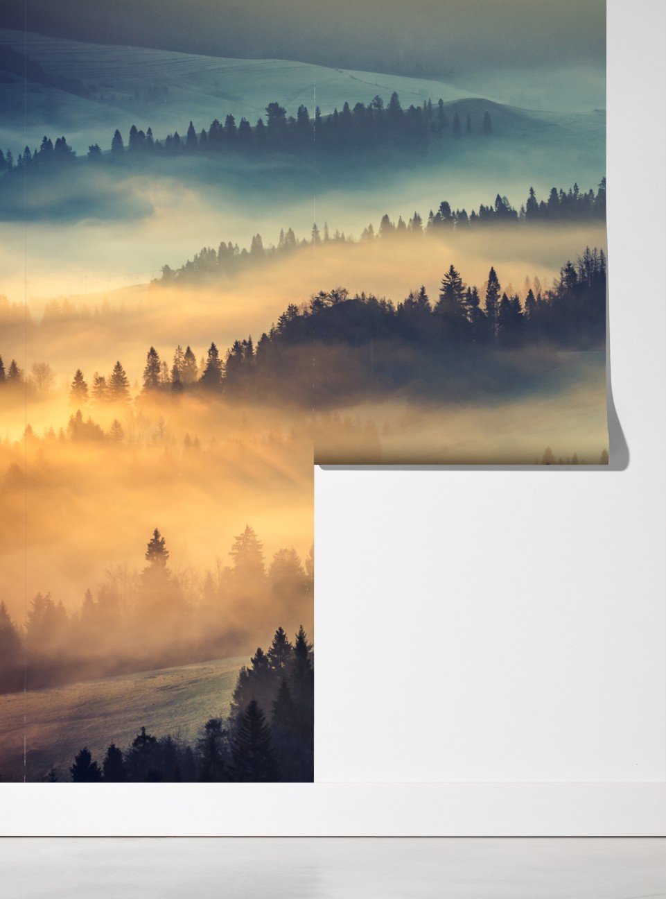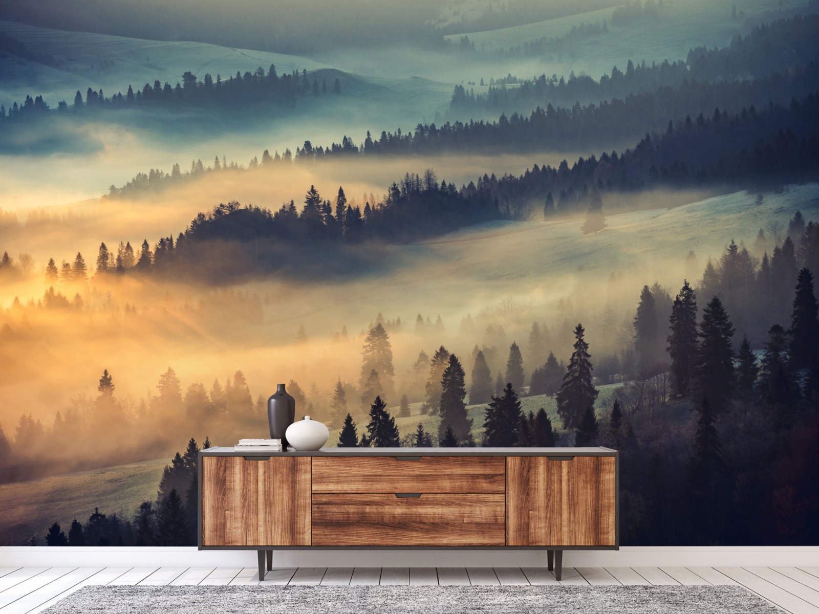 Ein ruhiger, nebliger Bergwald im goldenen Licht des Sonnenaufgangs, ideal um eine natürliche und entspannende Atmosphäre im Raum zu schaffen.