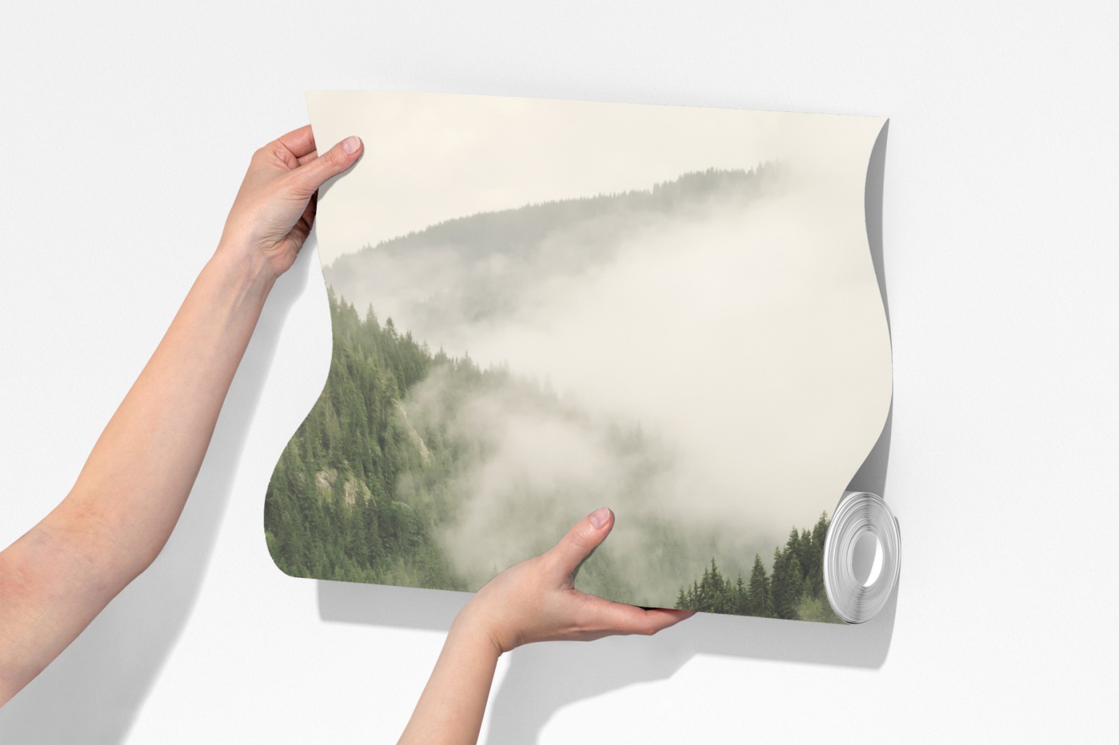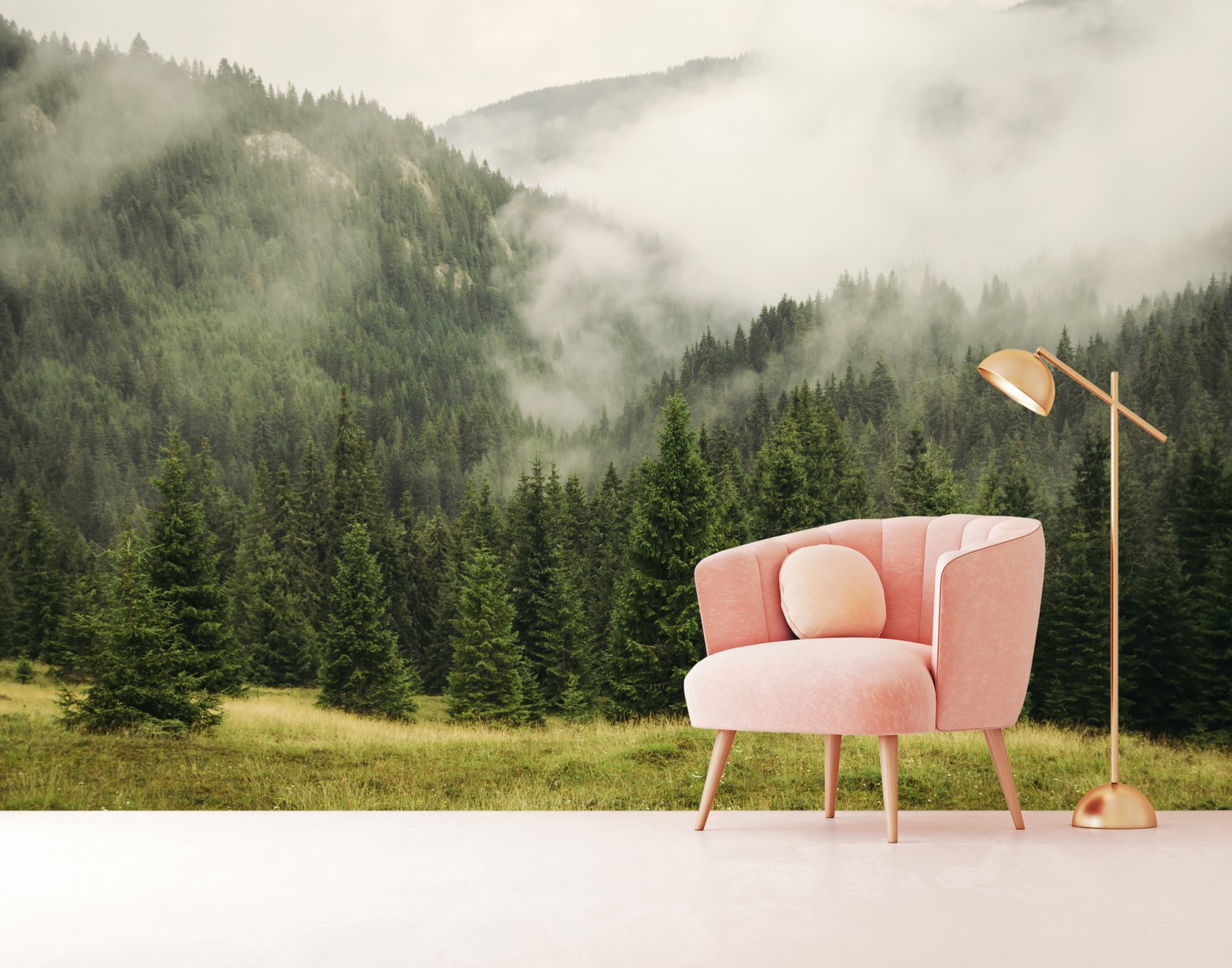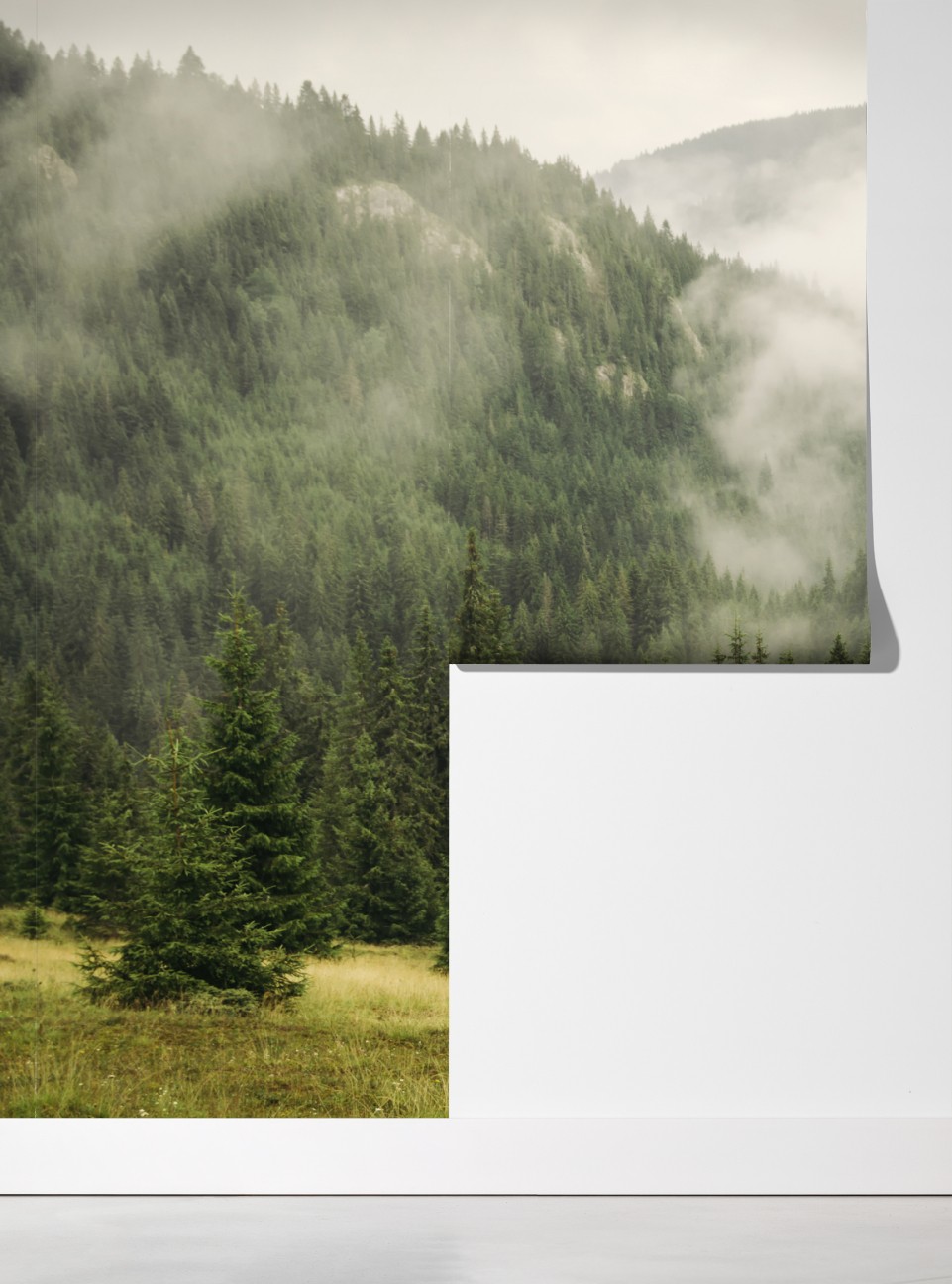 Eine ruhige, nebelverhangene Nadelwaldlandschaft, die natürliches Flair und Gelassenheit in jeden Raum bringt.