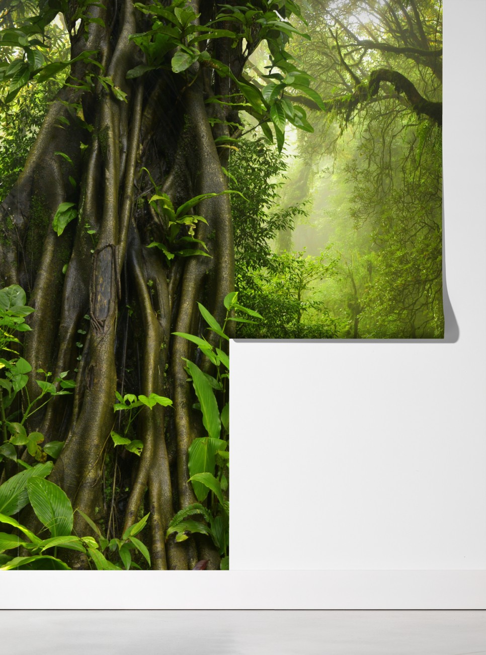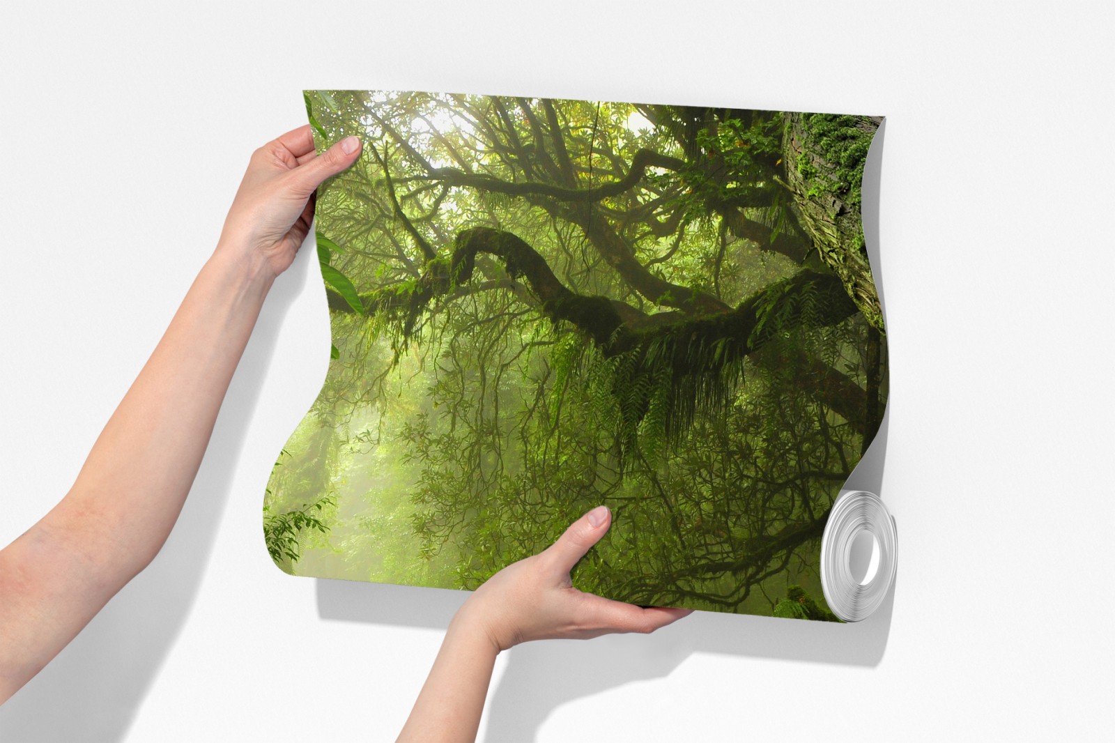 Bringen Sie die beruhigende Schönheit eines nebligen Regenwaldpfads in Ihre Räume mit diesem lebendigen grünen Waldbild.