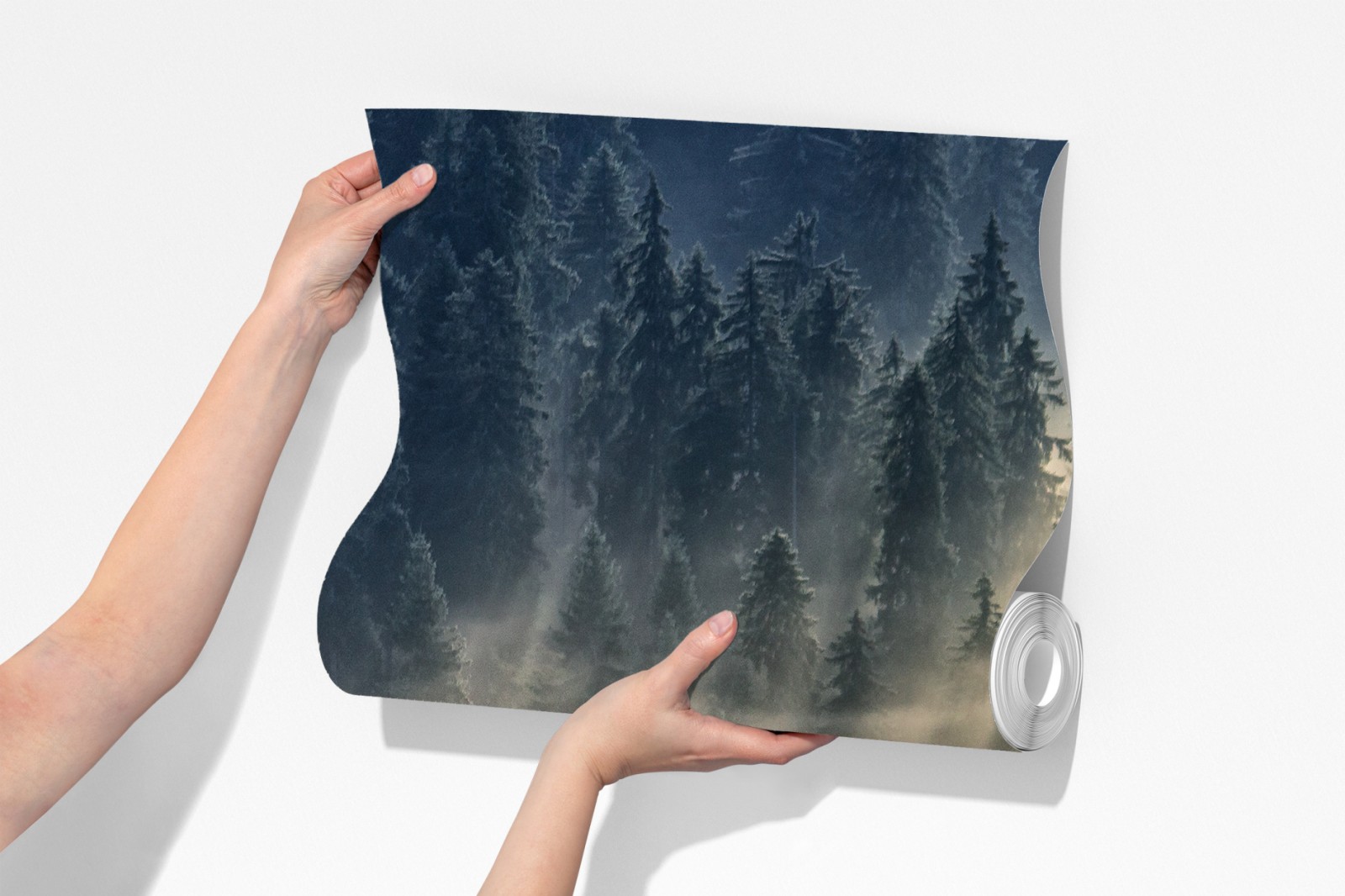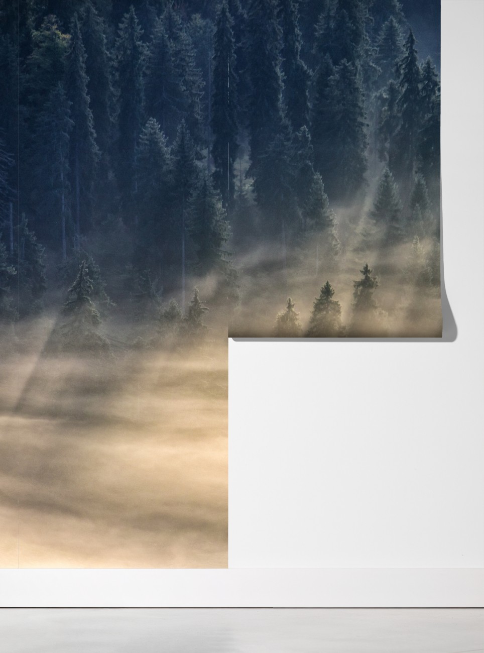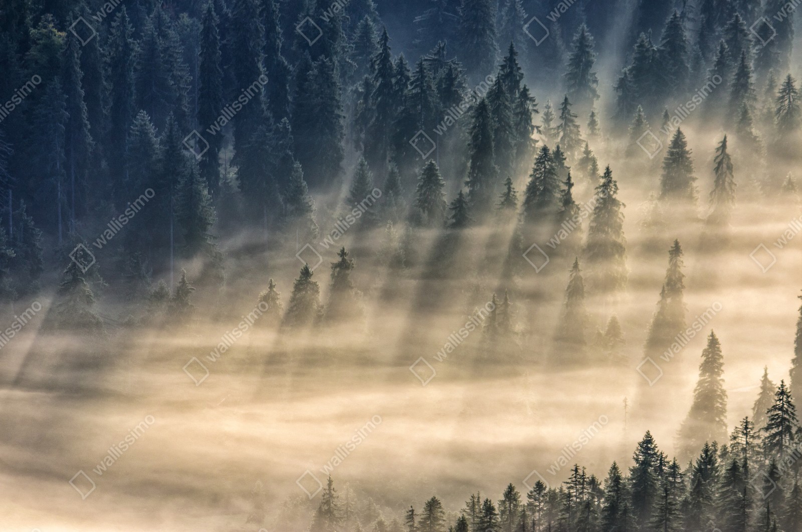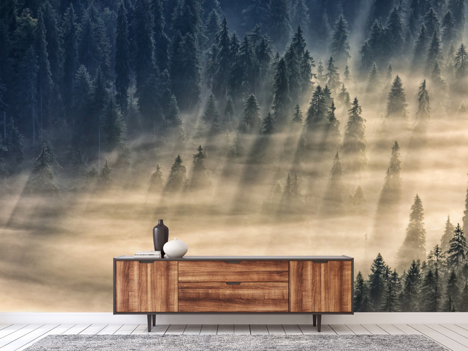 Fototapete nebliger fichtenwald im sonnenlicht – Wallnifity®