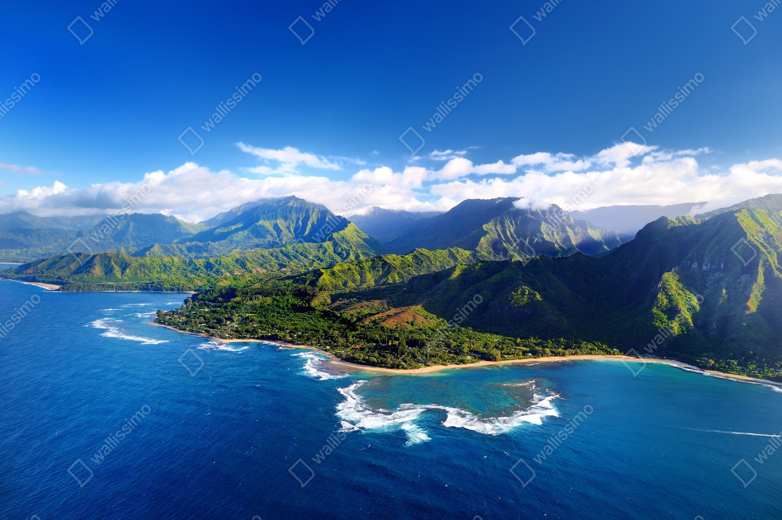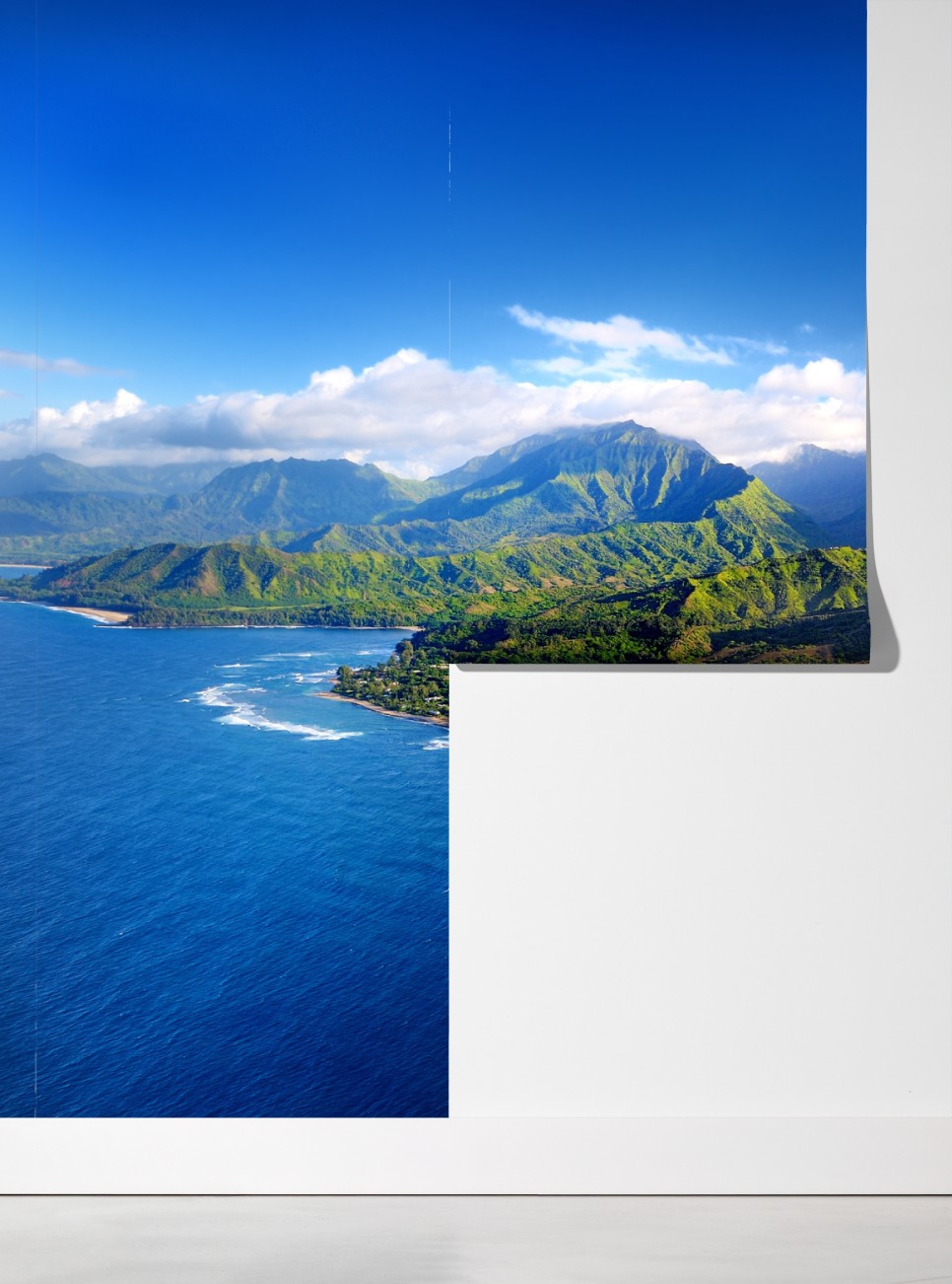 Bringen Sie beruhigende Meeresblicke in Ihr Zuhause mit diesem lebendigen Luftpanorama tropischer Küste, das tiefe Blautöne und üppiges Grün vereint.