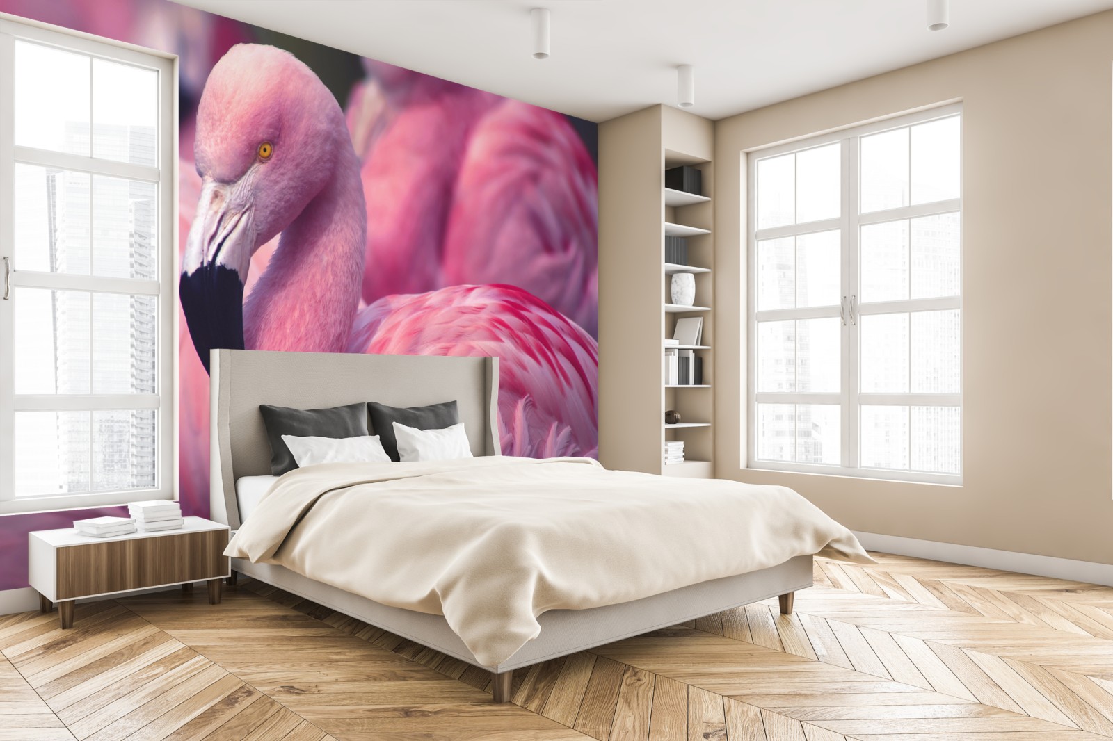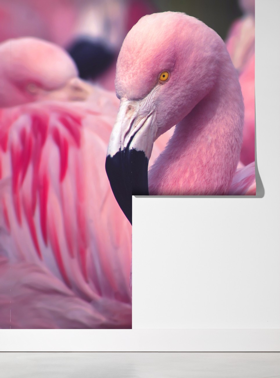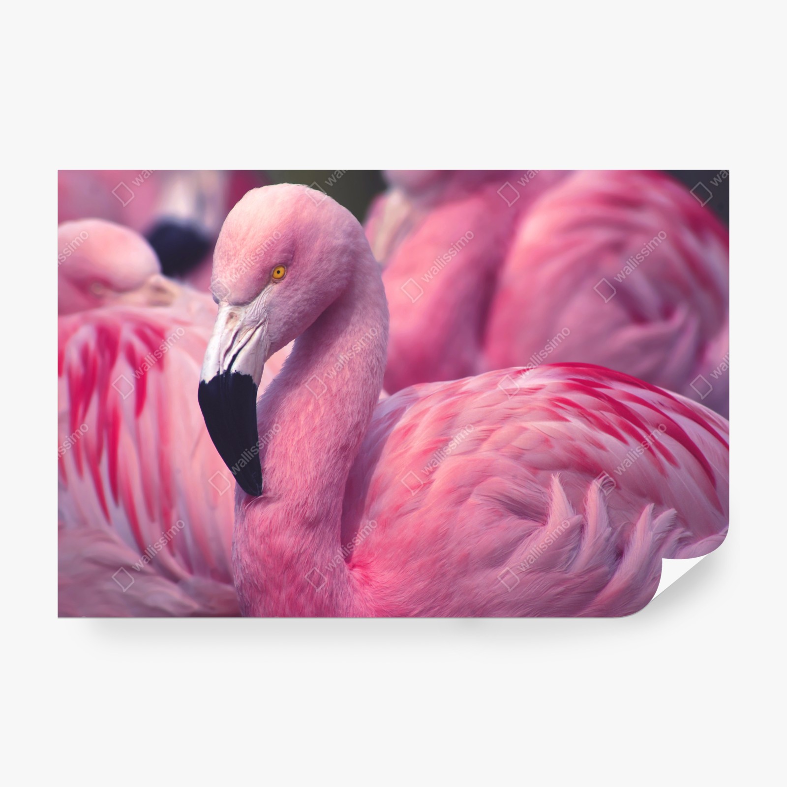 Nahaufnahme eines rosa Flamingos mit detaillierten Federn und eleganter Haltung, ideal um jedem Raum tropische Farbe und Charme zu verleihen.
