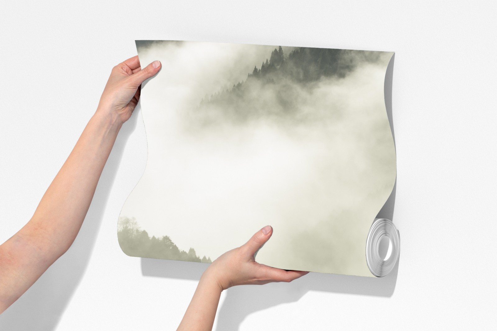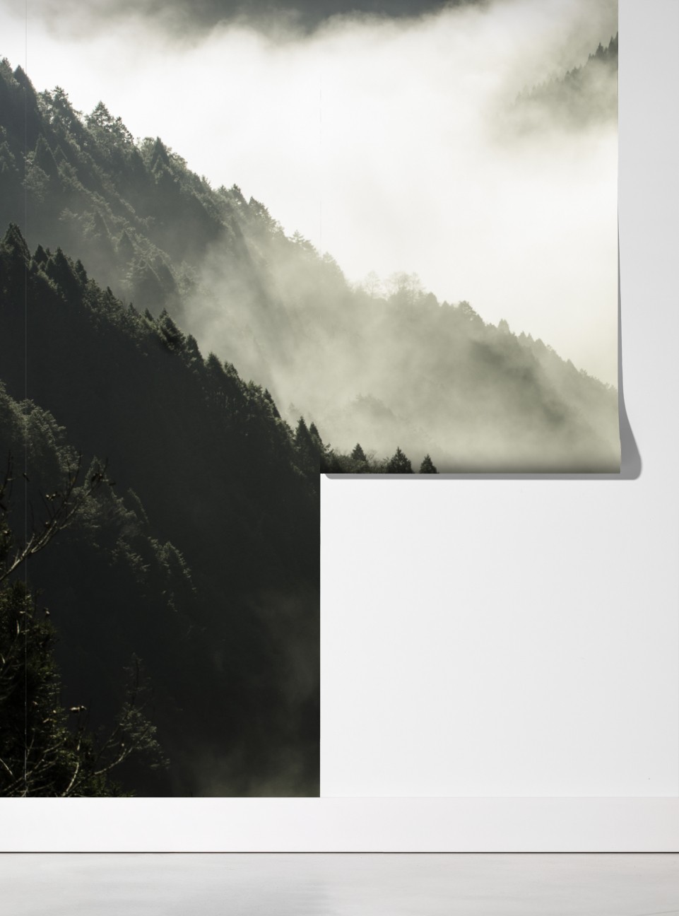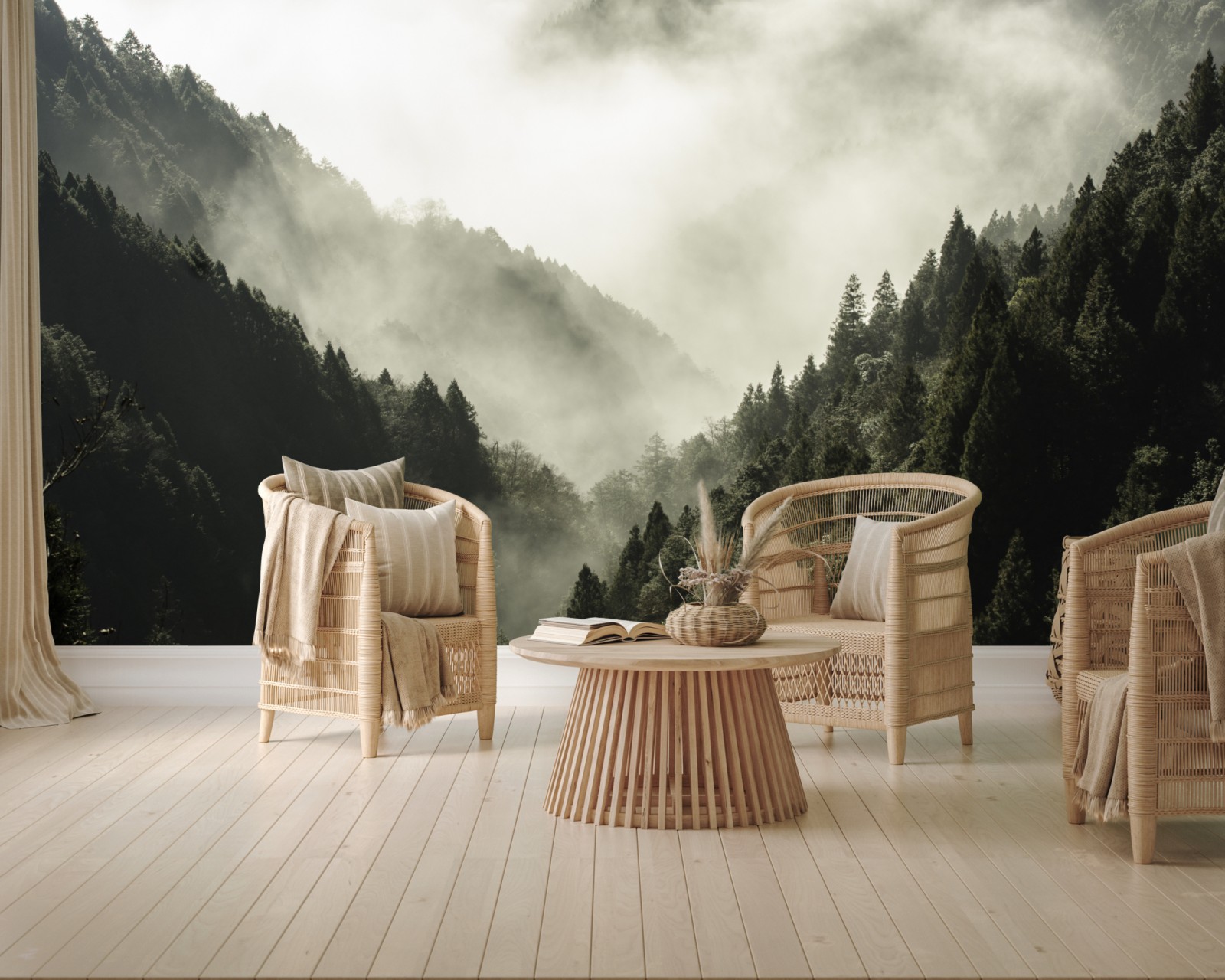 ein ruhiges, nebelverhülltes bergtal, das natürliche gelassenheit und atmosphäre in jeden raum bringt.