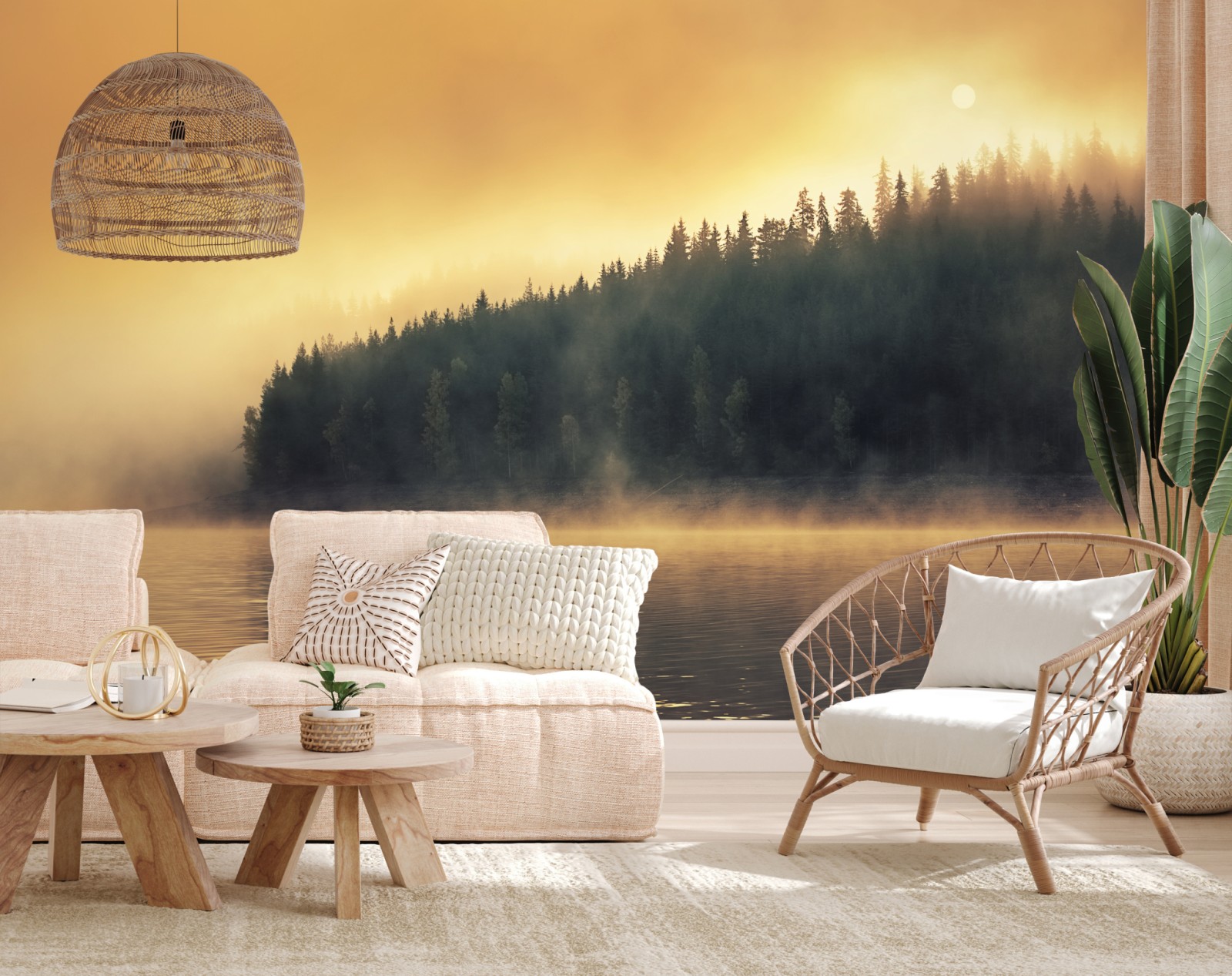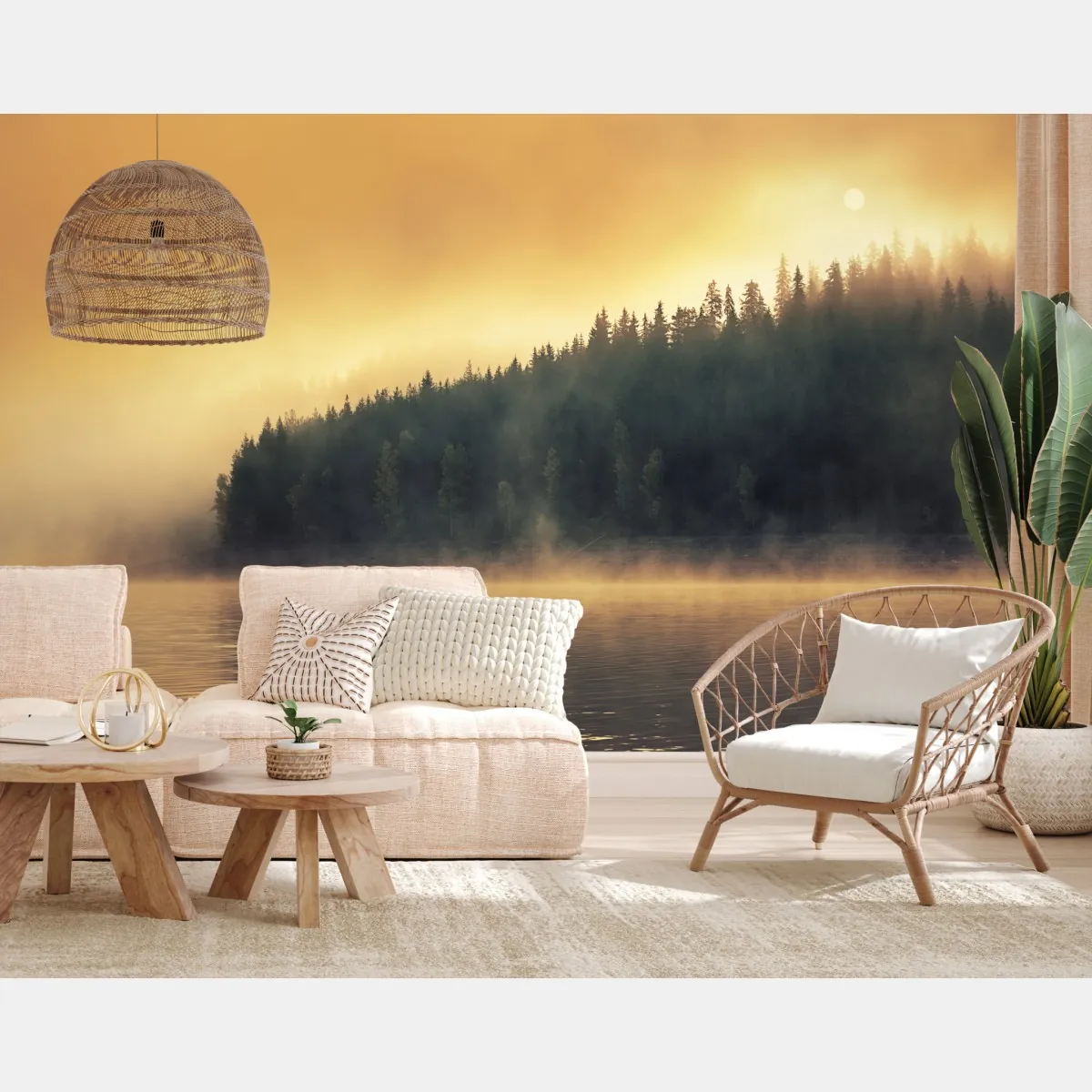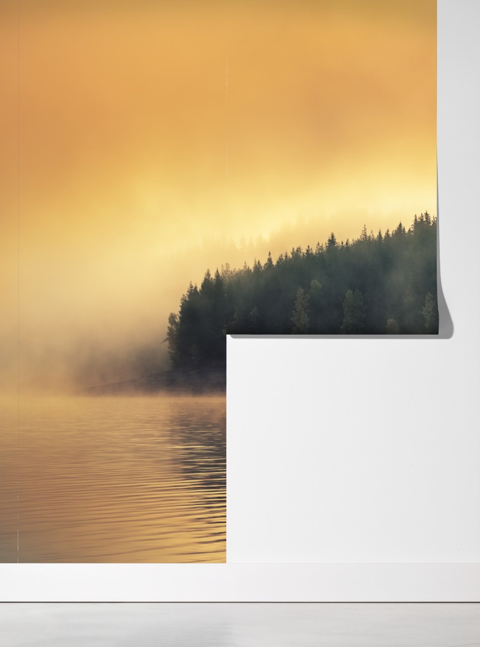 Fototapete nebeliger goldener sonnenaufgang über waldsee – Wallnifity®