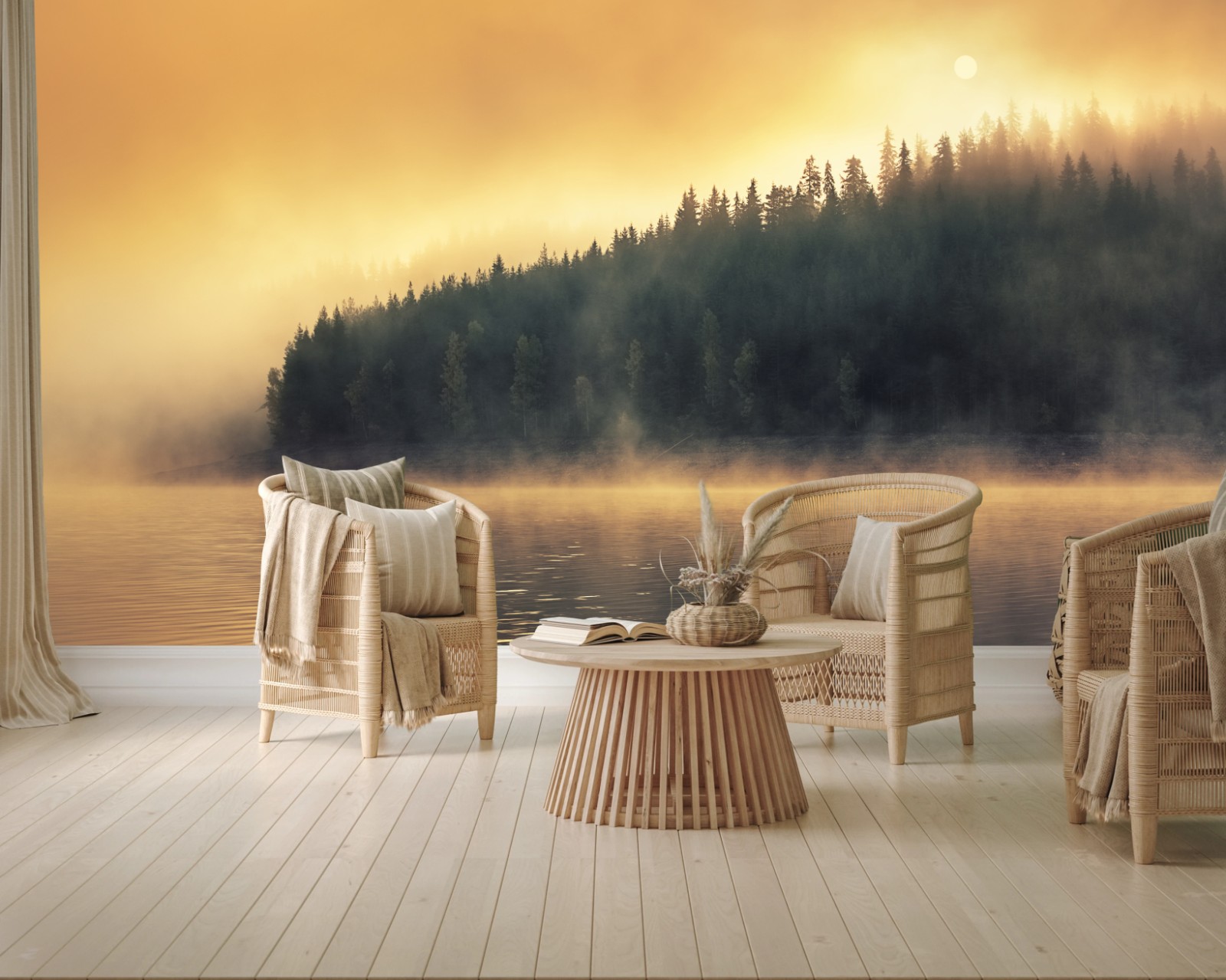 Fototapete Nebeliger goldener sonnenaufgang über waldsee