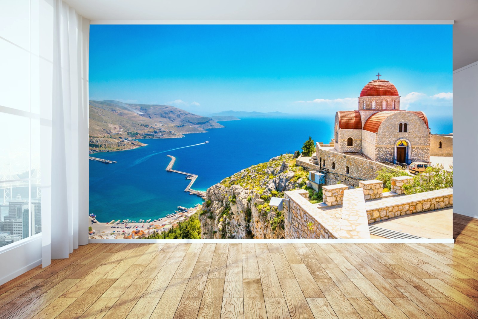 Fototapete Griechische kirche auf klippe über dem meer