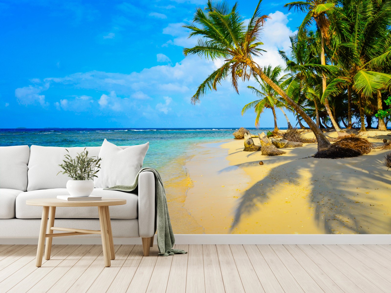 Helle tropische Strandaufnahme mit türkisfarbenem Wasser und wiegenden Palmen, die inselartige Gelassenheit in jeden Raum bringt.MehrWeniger